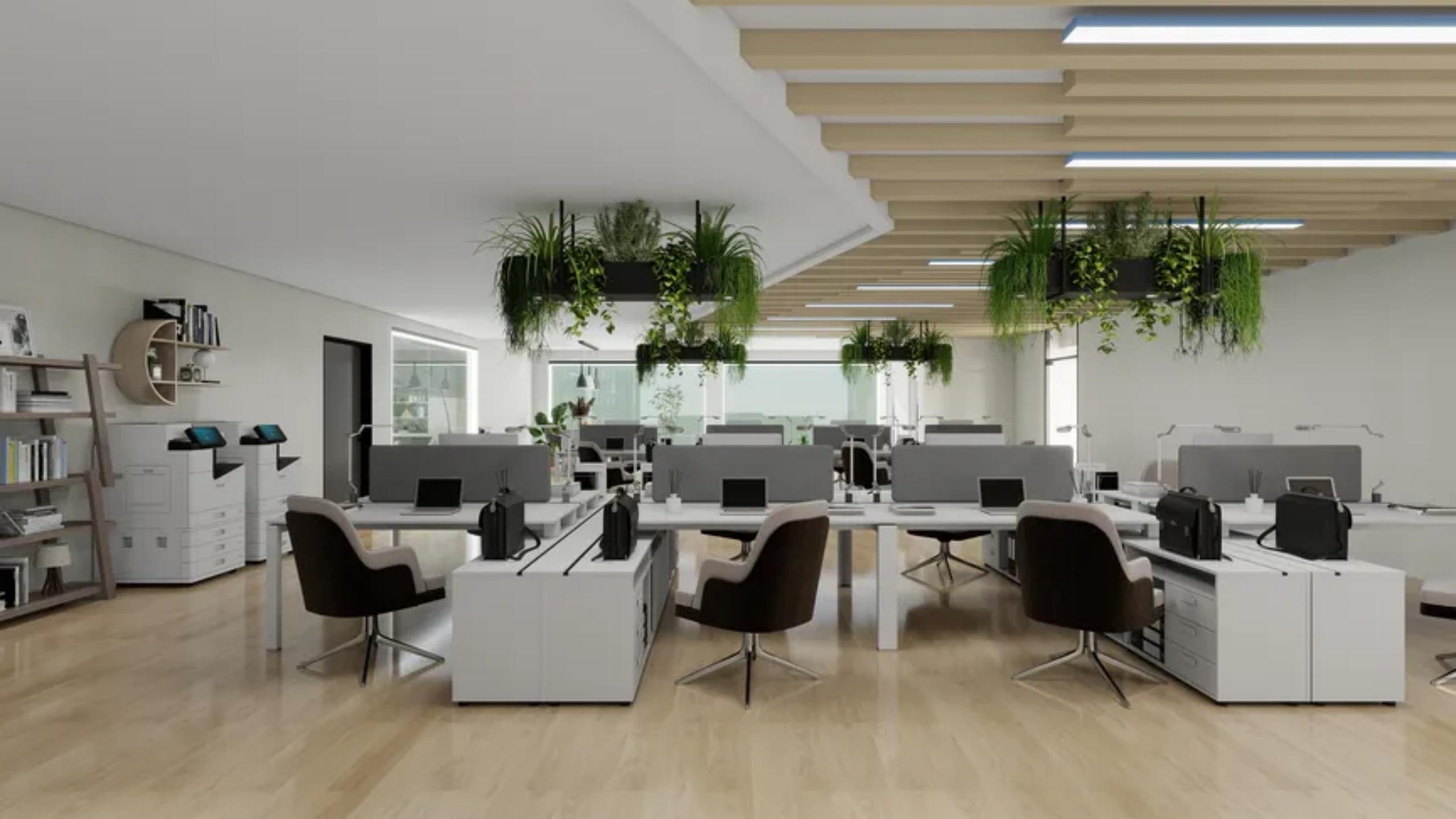 整体空间以浅白与木色为基底,搭配大理石与皮革等材质,营造出沉稳大气的视觉基调。开放办公区采用模块化布局,浅木色工位与白色柜体形成轻盈感,顶部悬挂的绿植装置既柔化了空间线条,又实现了生态化办公氛围;线性顶灯与自然采光的结合,既保证了团队协作的开放性,又兼顾了个人专注工作的私密性。