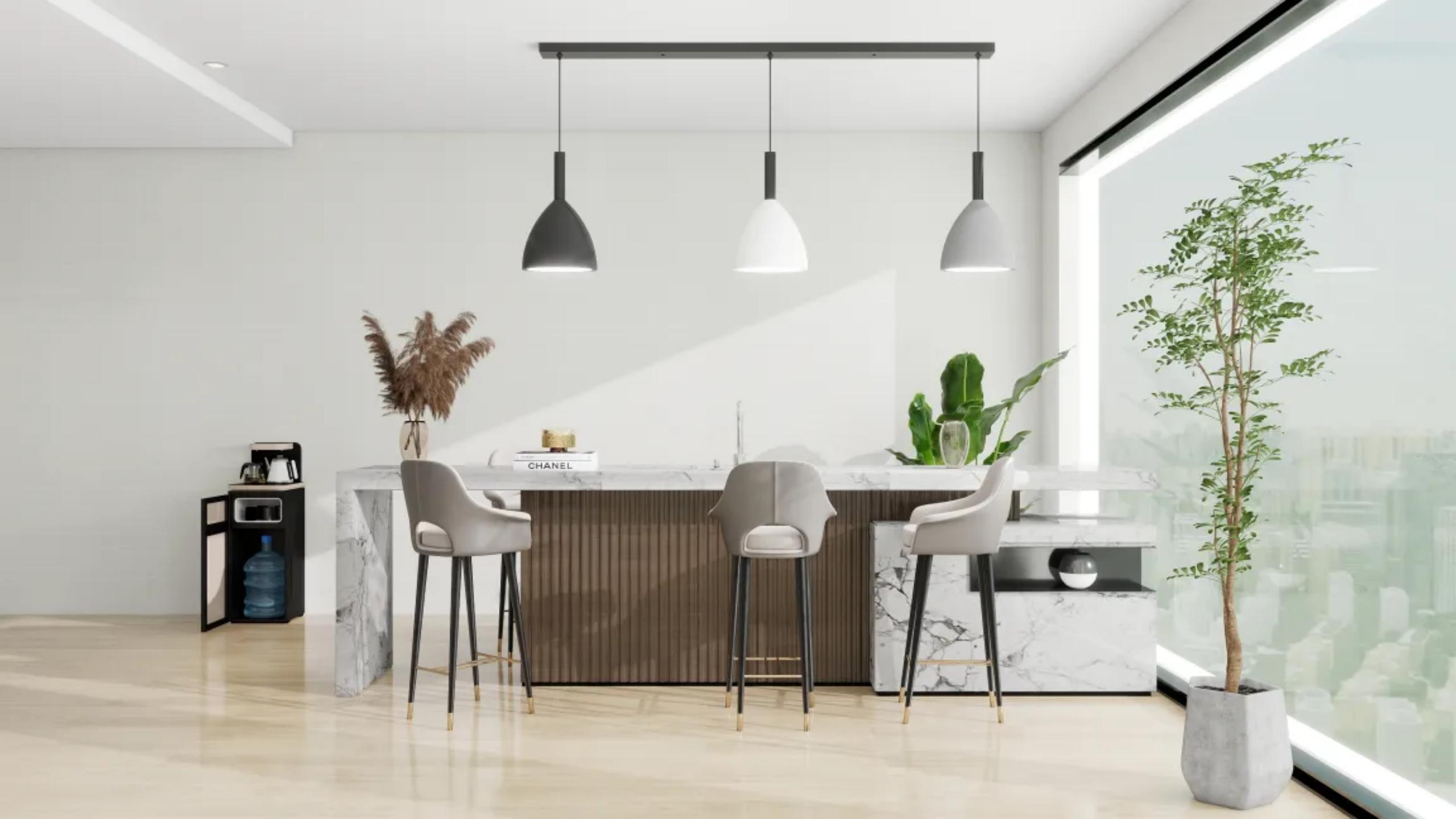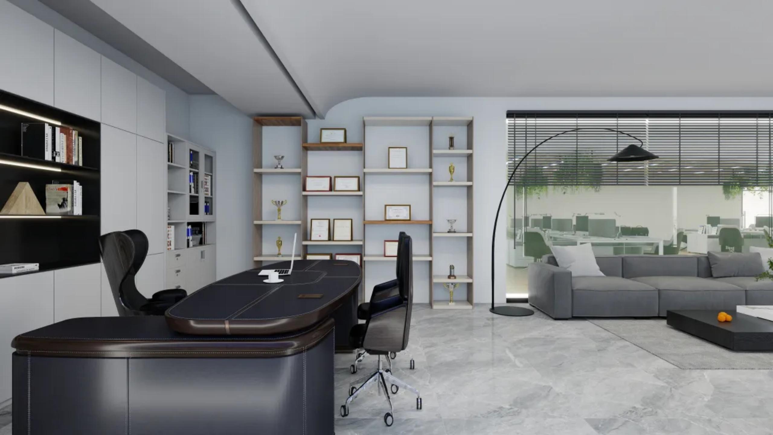 为了平衡工作与休憩,设计师在靠窗区域设置了休闲水吧与社交区,大理石吧台搭配浅灰高脚椅,三色吊灯点缀其间,成为员工交流与短暂休憩的核心场景;独立办公区则以浅米色沙发与柔和抱枕,营造出放松的洽谈氛围;高管办公室通过深棕皮革办公桌与大理石地面,彰显专业与品质,同时预留了充足的展示空间,用于陈列企业荣誉与文化符号。