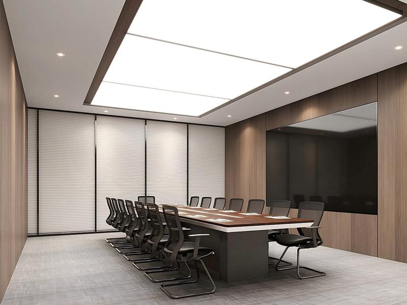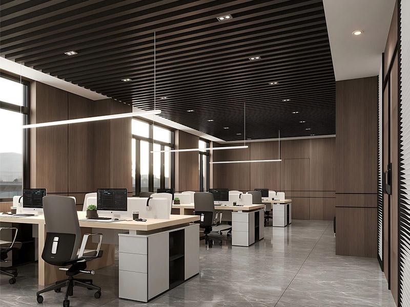 专业的会议空间里,木饰面包裹墙面搭配均匀顶光,规整的桌椅布局兼顾沟通效率与舒适体验,温润的材质弱化了商务场景的严肃感,让每一次正式洽谈都更具温度。开放办公区则以黑格栅顶与木饰面平衡工业利落与自然温润,大窗户引入充足自然采光,合理的工位布局既保障了团队高频协作的需求,也兼顾了员工的个人隐私,有效缓解工作疲劳,适配互联网、设计等行业的办公节奏。