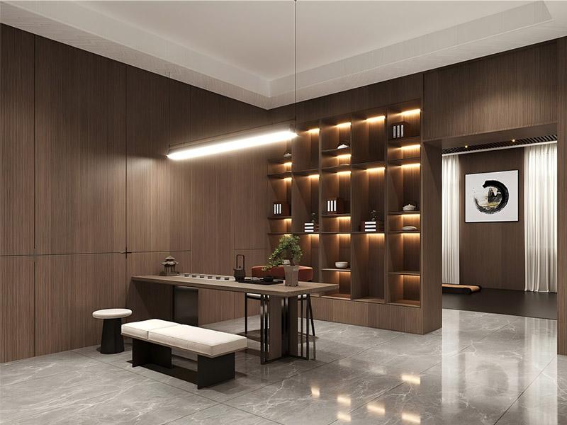 在文化与休闲空间的打造上,壹西格玛更显匠心。新中式接待区以木色家具搭配山水元素,营造沉稳雅致的洽谈氛围,适配注重文化底蕴的企业;茶室与洽谈区则以整墙书柜搭配简洁茶台,兼具储物与展示功能,禅意满满的设计既可供员工休憩,也能满足轻商务洽谈需求,彰显企业人文关怀。