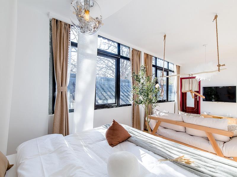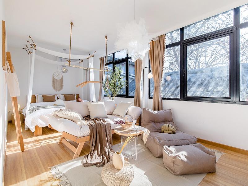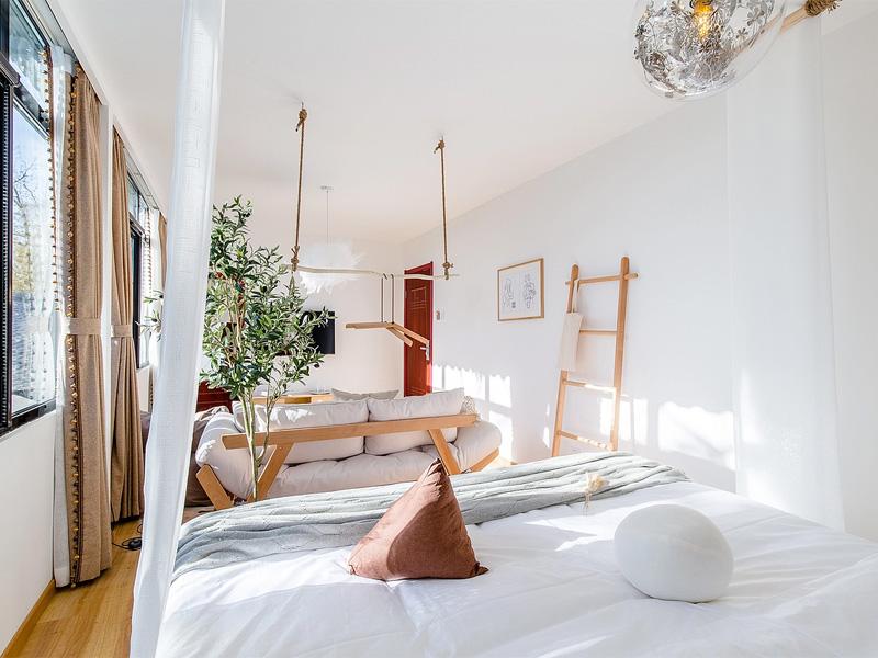 空间以纯净的白与原木色为基底,营造出松弛治愈的氛围。天然树枝与麻绳编织的吊顶装置,搭配捕梦网与白纱幔,将自然元素与手工质感巧妙融合,弱化了空间的边界感。开放式布局中,木质框架的软榻与床铺采用米白、浅棕等大地色系,搭配手工编织抱枕与亚麻毯,让侘寂风的质朴与温暖自然流淌。大面积黑框落地窗引入充足自然光,浅棕窗帘与窗外的青瓦屋顶相映成趣,将城市烟火与自然诗意无缝衔接。