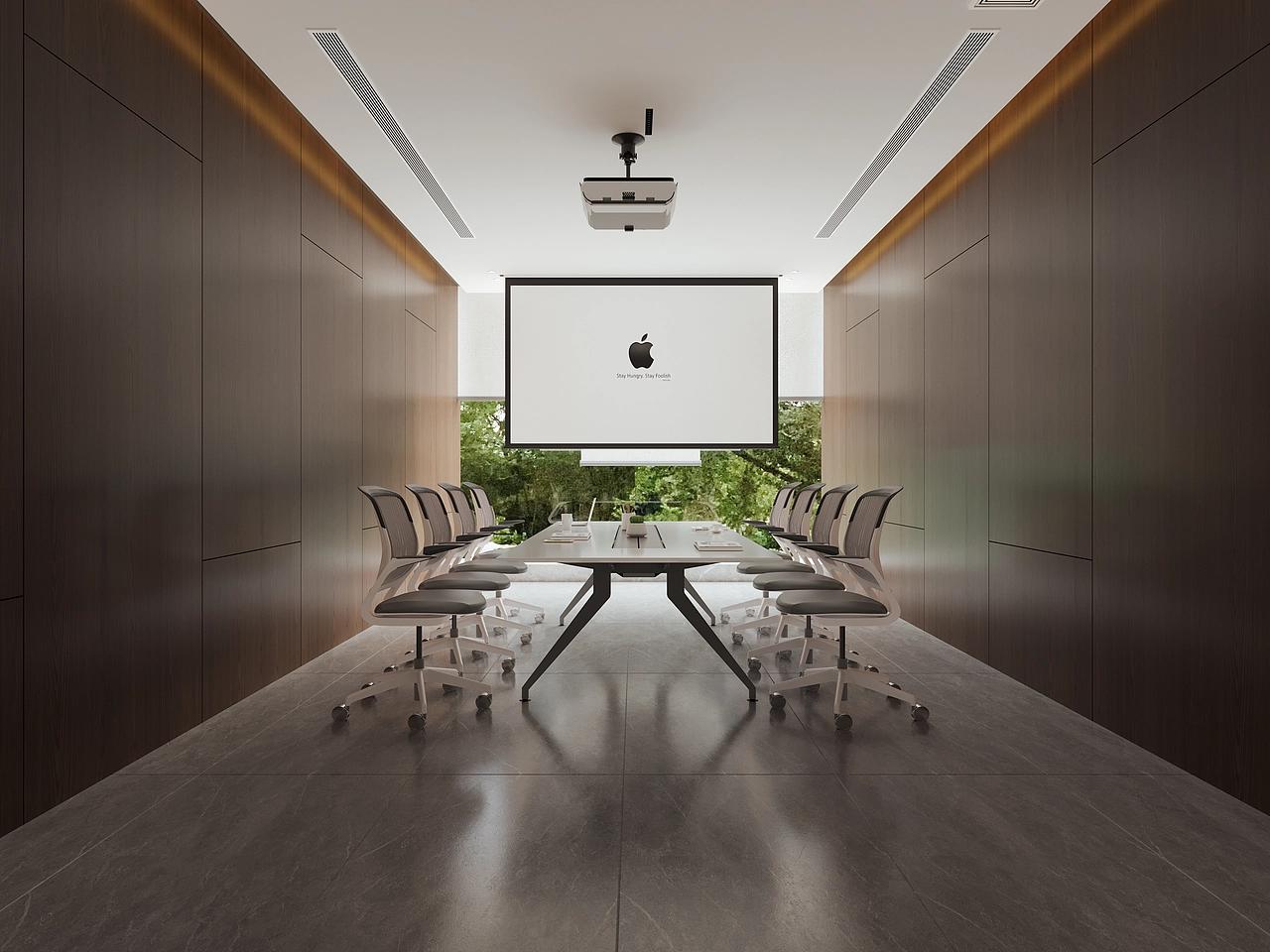 独立办公室位于空间内部,避开了外部动线的干扰,采用深色木饰面与白色墙面的强烈对比,营造出私密、专注的办公氛围,精准适配管理层及核心岗位的办公需求,既保证了决策办公的私密性,也彰显了金融企业的专业格调。会议室作为商务洽谈、团队研讨的核心场景,采用长条桌与投影幕布的标准配置,两侧深色木饰面搭配顶部线性灯,既满足了金融会议的正式性需求,又通过简约的设计元素避免了空间的沉闷感,凸显出现代商务的简约质感。