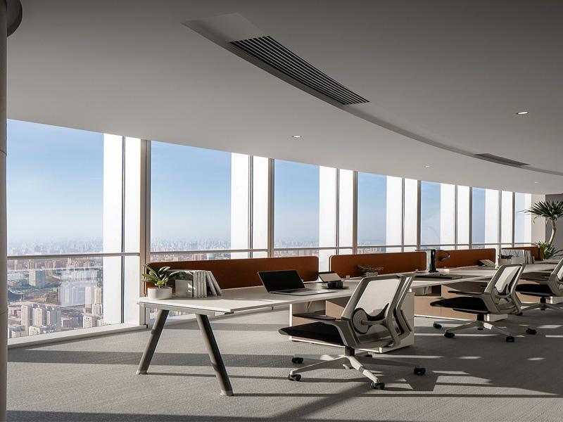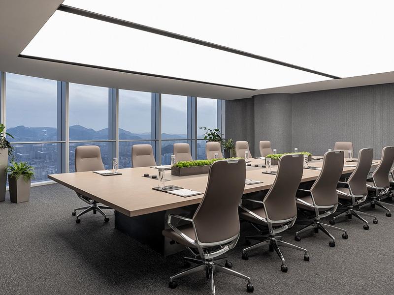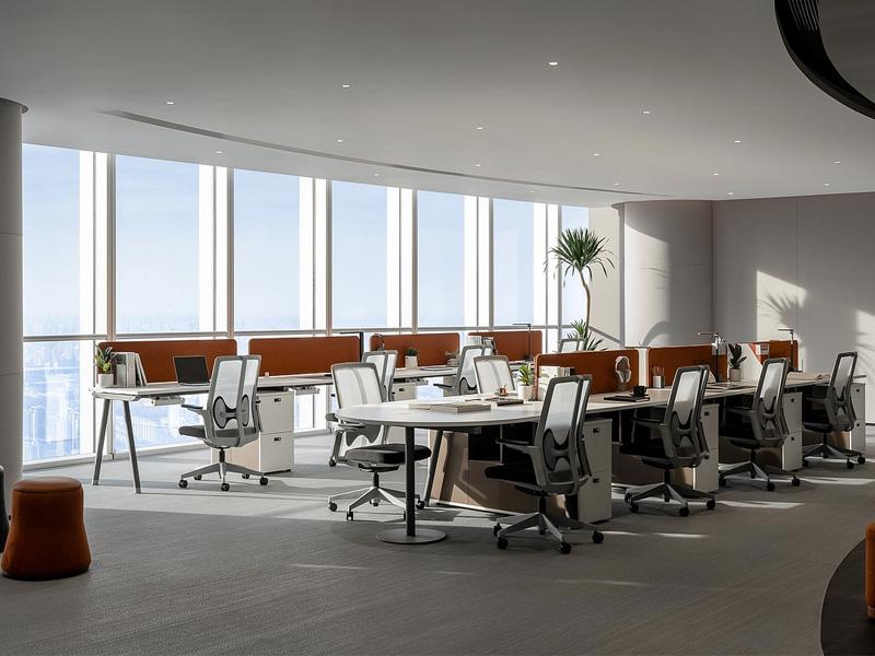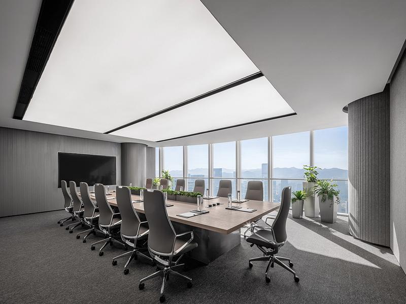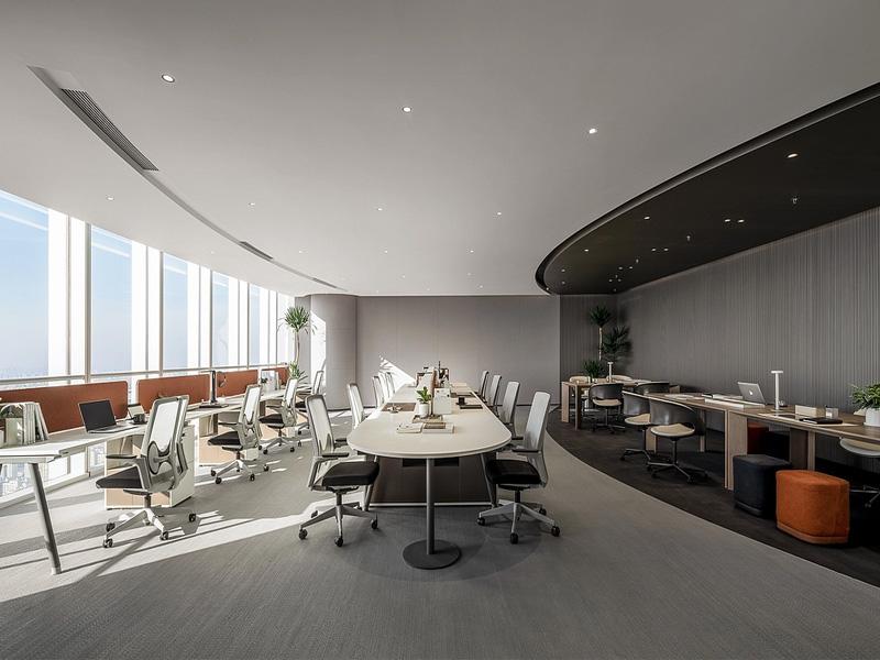 空间以浅灰与暖棕为主色调,打造出冷静、专业的办公氛围。大面积落地窗将城市天际线与远山引入室内,让自然光成为空间的天然光源;开放式办公区采用白色桌面与浅灰办公椅的经典搭配,搭配暖棕隔断,在视觉上划分出不同功能区域,同时注入活力。中央的椭圆会议桌与大型会议室的长桌,既满足了团队协作与商务洽谈的需求,又通过简约线条强化了空间的秩序感。