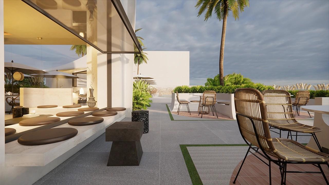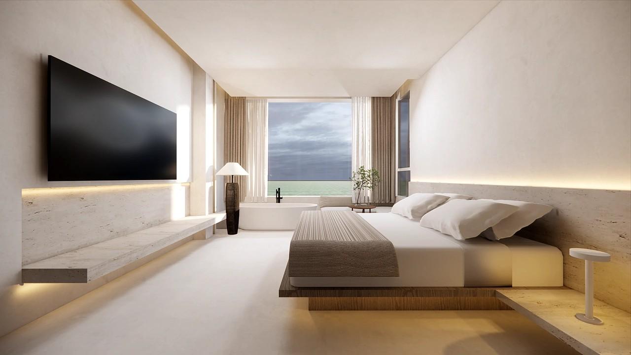 灯光设计遵循自然光优先、人工光辅助原则,公共区域与客房均最大化开窗引光,让阳光在墙面与地面形成丰富层次;辅助灯光采用隐藏式灯带、线性射灯与简约吊灯,暖黄色调柔和不刺眼,夜晚点亮时与海景相映,营造治愈的度假氛围。同时,公装设计充分考虑动线规划,公共休闲区、接待区、客房区分区清晰,流畅便捷,兼顾客流疏导与私密保护。