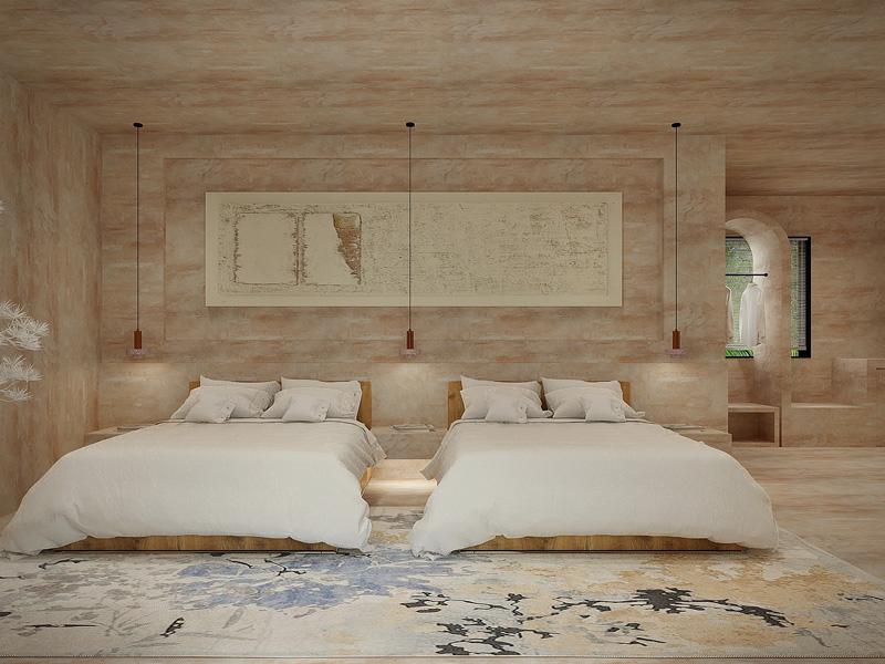 整体设计以弱化人工痕迹、拥抱自然本真为理念,把苍山洱海的风光作为空间的核心装饰,让建筑成为自然与生活的容器。空间摒弃繁复造型与艳丽色彩,以质朴肌理与柔和光影营造宁静氛围,既满足民宿的公共接待、休闲社交功能,又保障客房的私密与舒适,实现公装尺度下的精致与松弛感平衡。