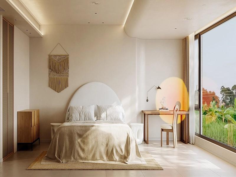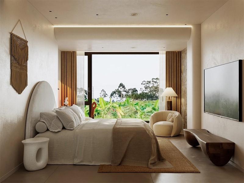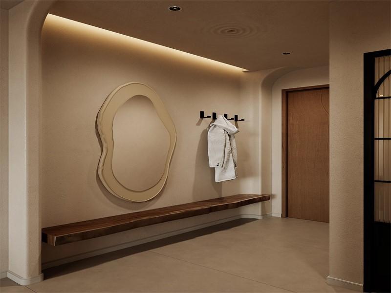 空间布局采用开放式设计,将休闲区、卧室与卫浴区自然衔接。玄关处,不规则造型的木质长凳与艺术感镜子,在柔和的灯带烘托下,成为进入空间的第一处视觉焦点;卫浴区以粗犷石纹墙面搭配木质台盆,将洗衣功能与洗漱区整合,兼顾实用与美学;卧室区域则以弧形床头、编织挂饰与大面积落地窗,让户外的绿意与自然光成为空间的一部分,营造出松弛的休憩氛围。