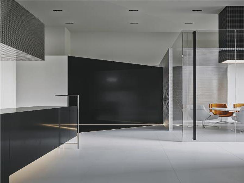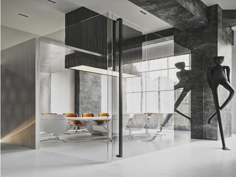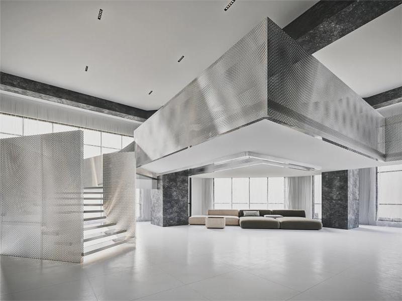 设计团队摒弃冗余装饰,以大面积浅灰水磨石地面与纯白哑光墙面为基底,营造出通透开阔的视觉基调。深灰色大理石柱体与黑色几何墙面作为视觉锚点,在简洁中注入力量感;金属穿孔板与超白玻璃隔断则以轻盈通透的姿态,划分出开放办公区、会议区与休闲区,既保证了空间的流动性,又实现了功能分区的清晰界定,让自然光与视线自由穿梭。