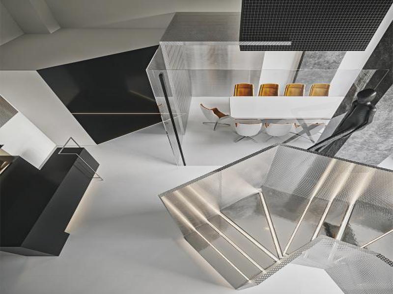 在动线规划上,悬浮式金属楼梯与挑空平台成为空间的视觉焦点,不仅连接了上下楼层,更以雕塑感的形态强化了未来主义氛围。办公区的模块化家具与会议区的橙色座椅点缀,在冷静的基调中注入活力,兼顾了协作效率与舒适体验;而挑空区的模块化沙发组合,则为员工提供了灵活的非正式交流场景。