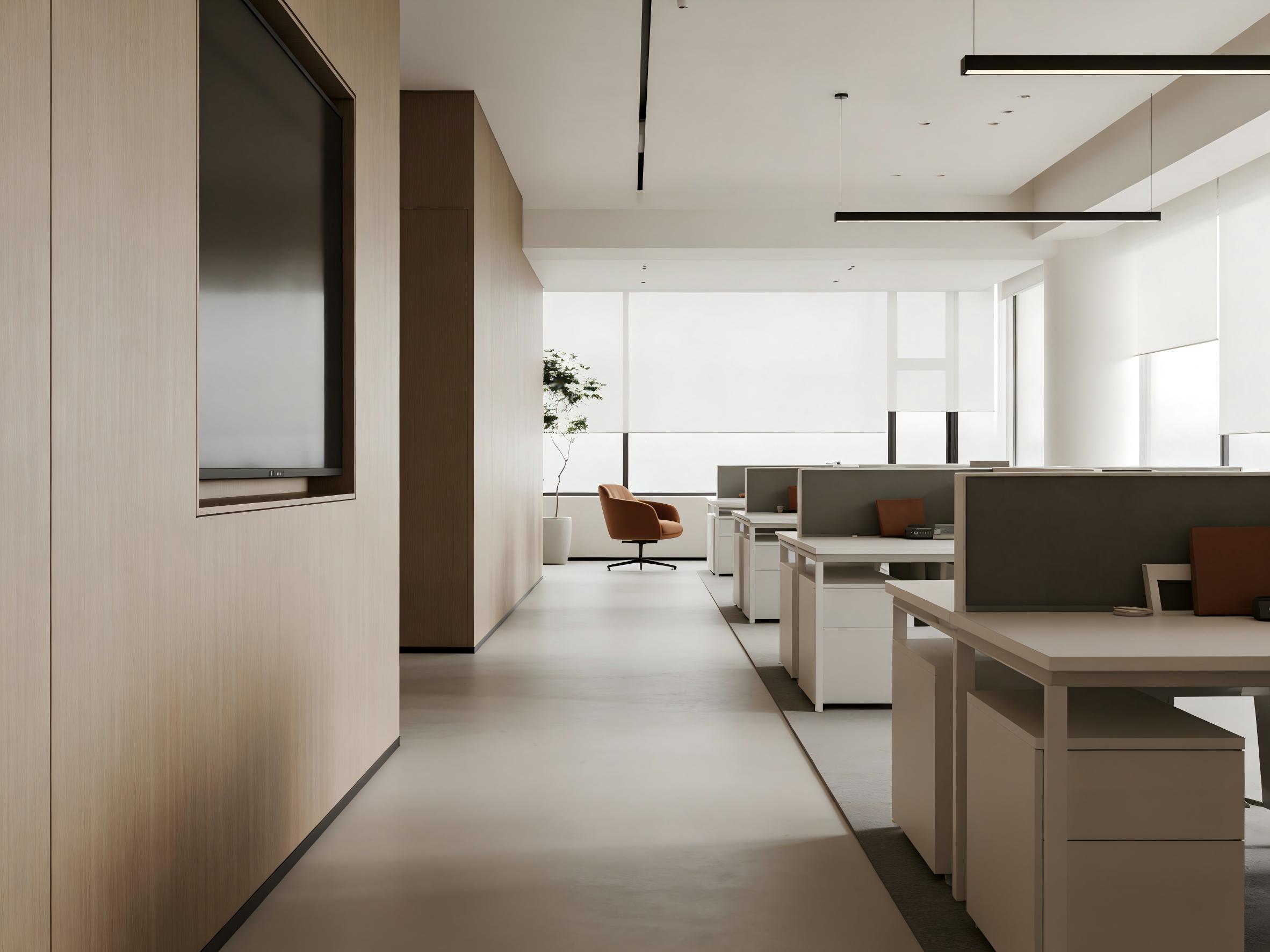 壹西格玛的设计核心的是平衡功能与美学,摒弃冗余装饰,让空间服务于办公需求。其推出的简约现代开放办公区,以浅木色、米白与深灰为主色调,营造出通透高效的氛围。大面积落地窗引入充足自然光,搭配线性吊灯与嵌入式筒灯,既保障照明,又强化空间秩序感;开放式工位与休闲洽谈区合理布局,半高隔断兼顾协作与隐私,橙色单人椅作为点缀,为严谨办公注入活力,适配团队高效协作的需求。