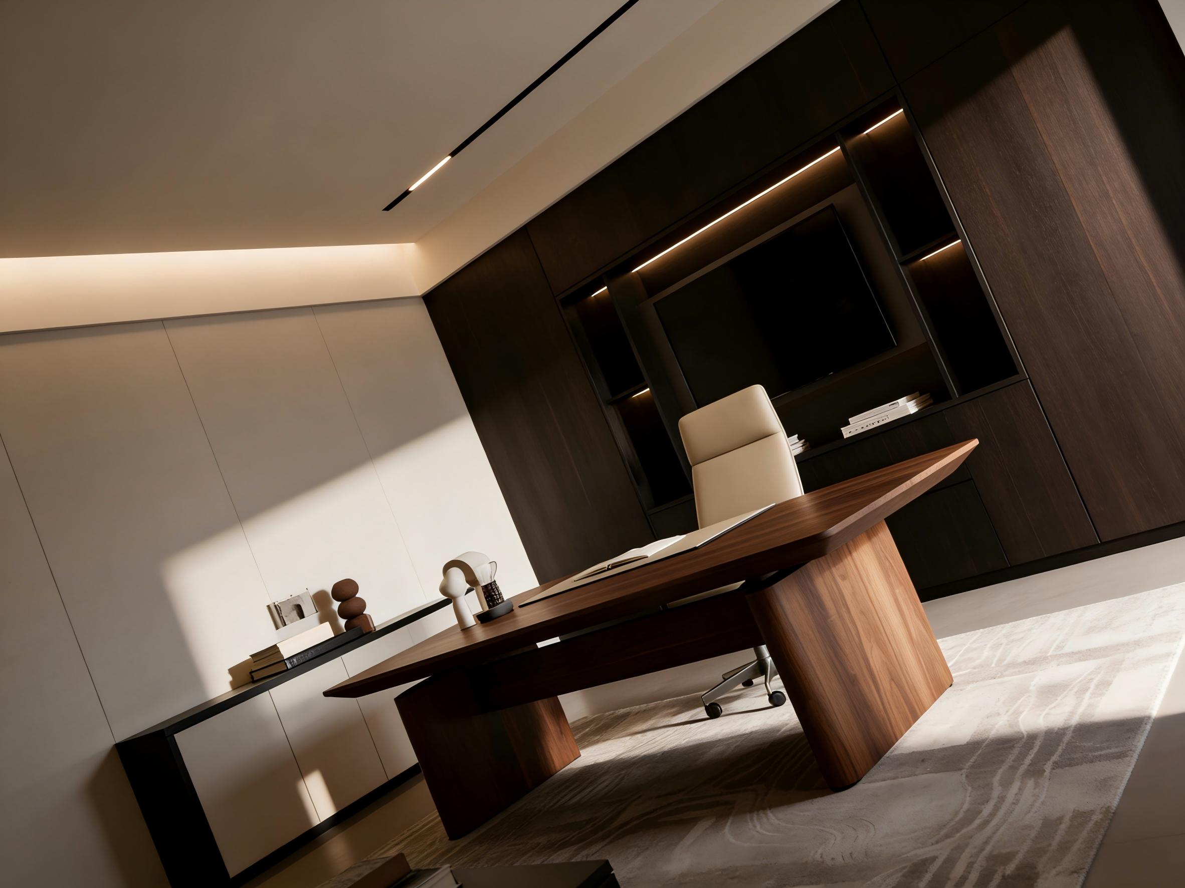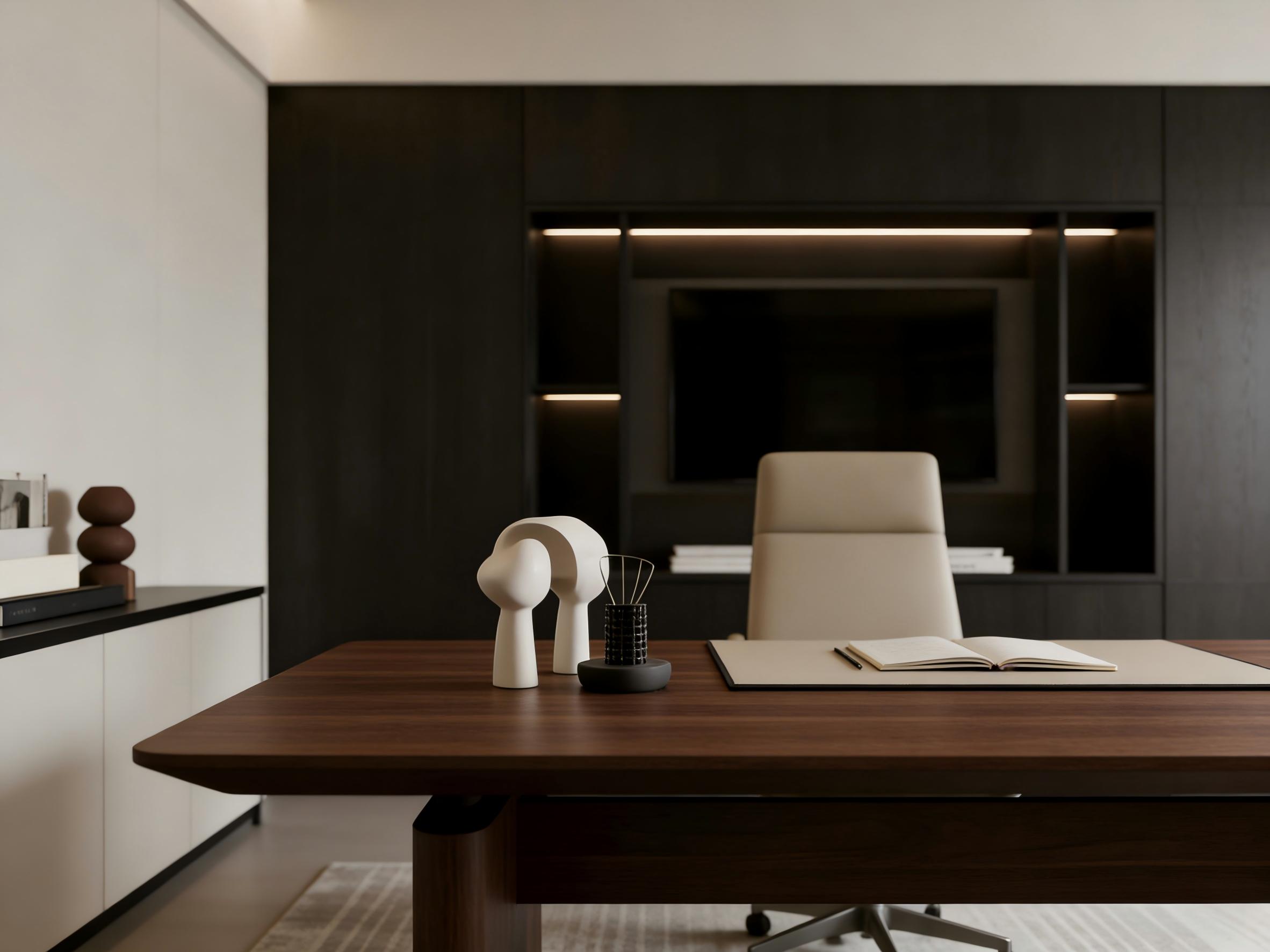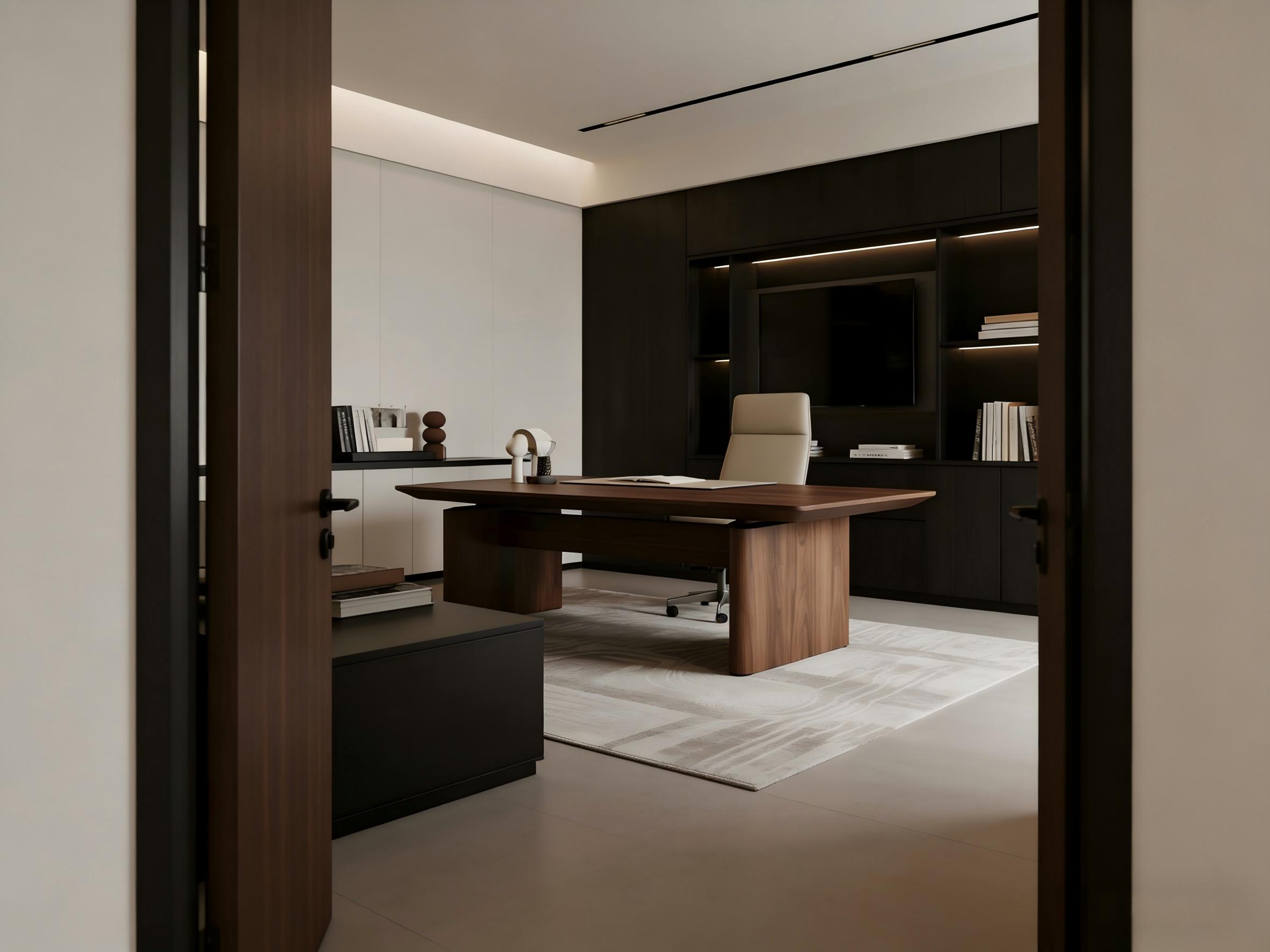 针对高管办公场景,壹西格玛打造了沉稳质感的独立办公室,精准契合决策者的身份与办公需求。空间以深胡桃木、哑光黑与米白为基调,通过大面积木饰面与哑光黑柜体的碰撞,搭配暖光线性灯带,彰显专业与高级感。布局上主次分明,宽大实木办公桌与高背皮椅构成核心办公区,整面定制柜体兼具收纳与展示功能,侧边矮柜摆放书籍与艺术品,让空间既有办公实用性,又有文化底蕴,成为企业形象的重要窗口。