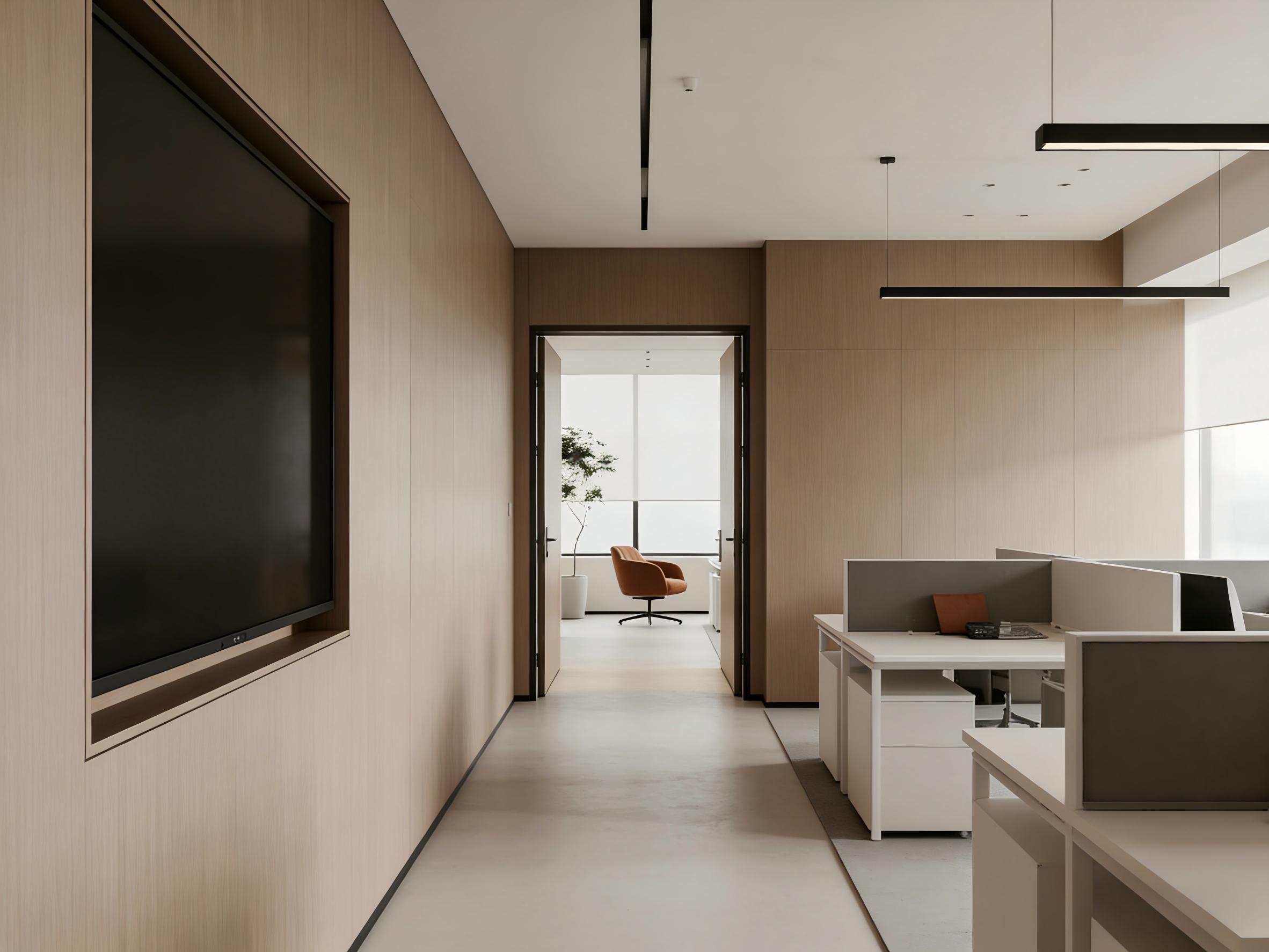 另一套高效协作开放式办公区,则以浅木色、深灰与白色为主体,聚焦高效办公需求。大面积极开放工位布局规整,顶面木格栅与线性灯划分功能区域,深灰色地毯有效降噪,提升办公舒适度。尽头的木饰面展示墙,可陈列企业荣誉与项目成果,传递企业文化,适配规模化团队的办公与管理需求。