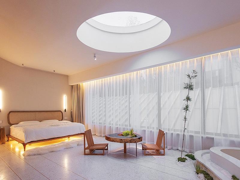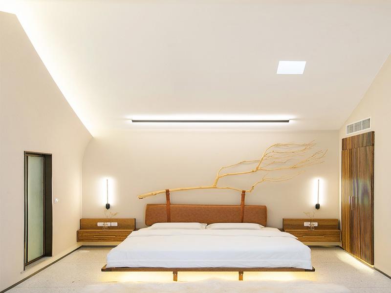项目的核心设计语言,是让建筑与自然对话。客房区域采用大面积的天窗与落地窗设计,让天光与山景成为空间的天然装饰。温润的原木与柔和的米白色调构成了空间的主基调,既延续了工装设计中对材质质感的极致追求,又营造出侘寂风的静谧氛围。床头的艺术装置、悬浮的床体设计,以及地面的水磨石肌理,无不体现着成都民宿酒店装修对细节的把控。