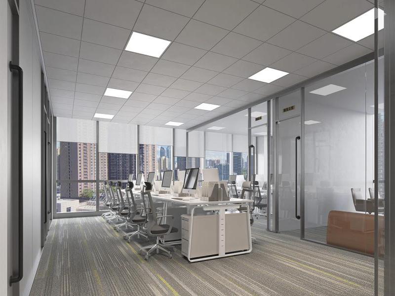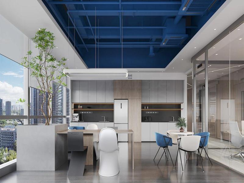 休闲区则以蓝色吊顶与浅木色柜体营造出轻松的氛围,绿植点缀其间,为员工提供了一个从高强度工作中短暂抽离的 “能量补给站”。玻璃隔断的运用,既保证了空间的通透感,又实现了功能分区的清晰界定,让整个办公空间在开放与私密之间取得了精妙平衡。