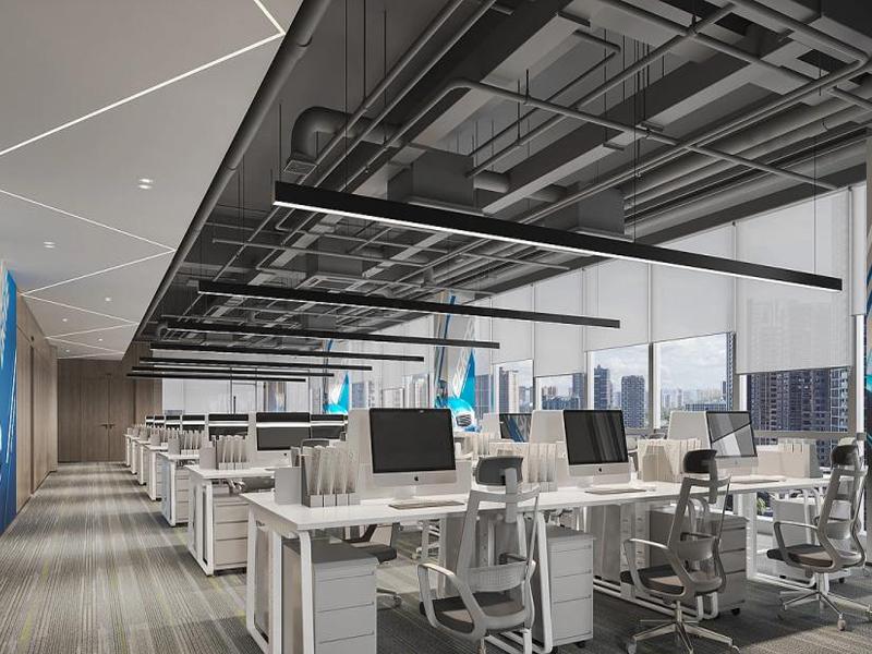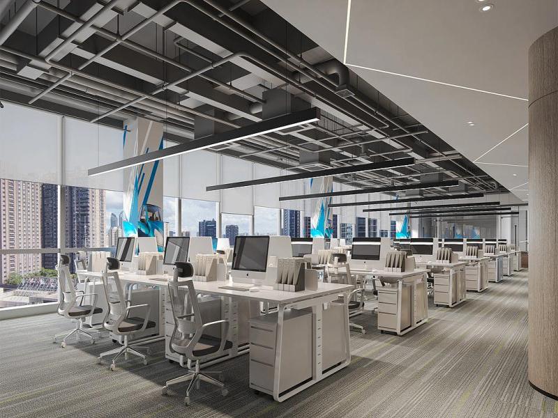 开放办公区采用工业风裸顶设计,灰色管道与黑色线性灯条交错排布,搭配浅灰条纹地毯,既展现出利落的科技感,又通过柔和的色彩过渡弱化了空间的硬朗感。整排白色办公台与人体工学椅有序排列,配合大面积落地窗引入的自然光线,让整个区域通透开阔,有效提升了员工的工作专注度与幸福感。