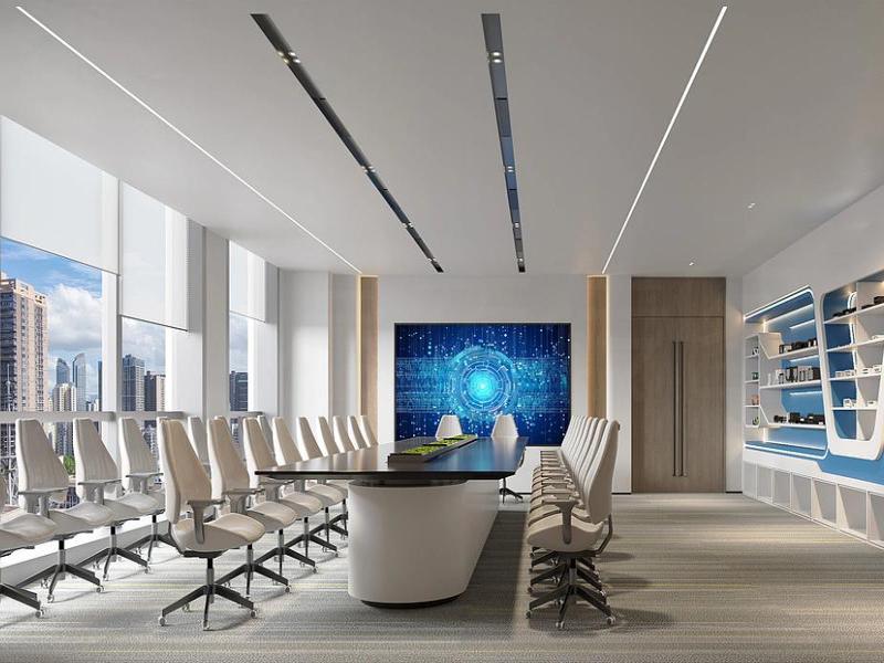 会议室作为企业决策与沟通的核心空间,设计上更注重专业与仪式感。浅米色皮质座椅环绕着流线型会议桌,背景墙的蓝色科技感屏幕与右侧蓝白相间的展示架形成呼应,既满足了多媒体会议的功能需求,也彰显了企业的创新形象