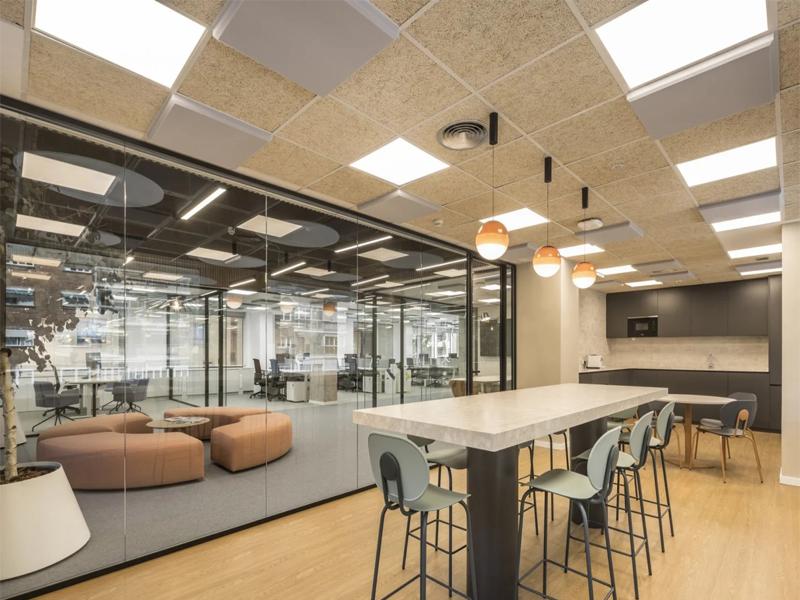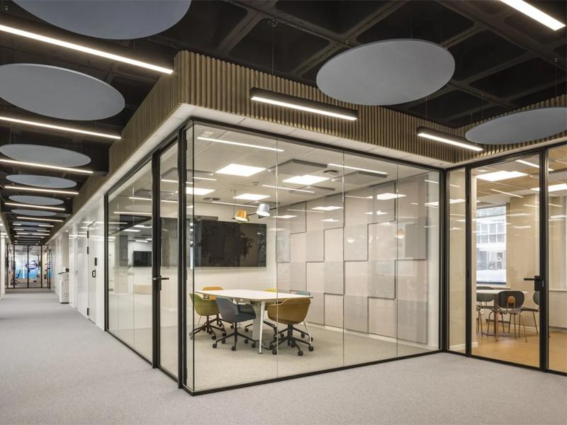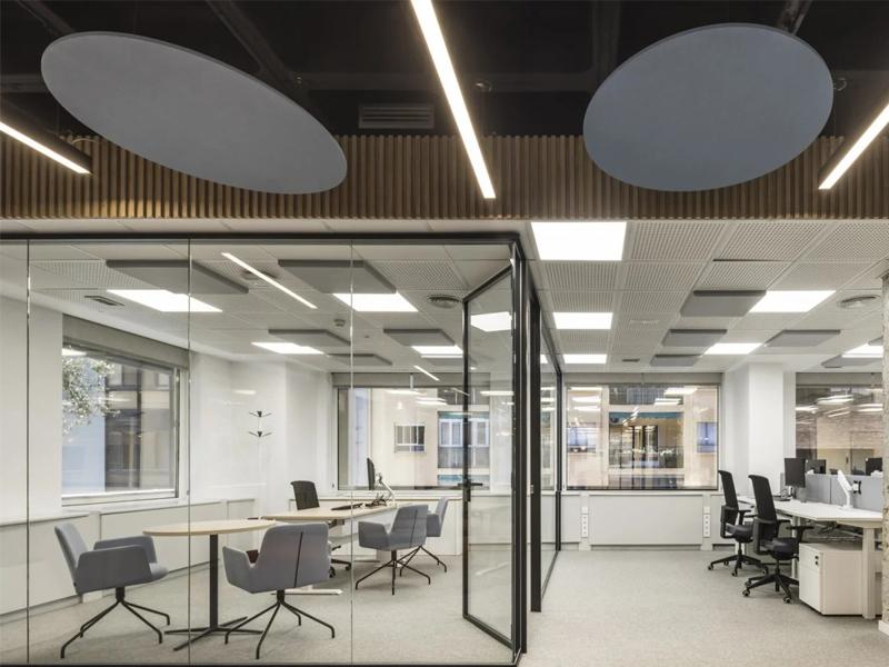 光线设计是本案的点睛之笔。大面积的落地窗将城市天际线引入室内,搭配顶部的线性灯带与圆形吸音板,形成了层次丰富的光影效果。白天,自然光与人工照明交织,让空间明亮而柔和;夜晚,灯光则勾勒出空间的轮廓,营造出沉稳而专业的商务氛围。同时,顶部的吸音板在兼顾美学的同时,有效降低了办公噪音,提升了空间的舒适度,让员工在高效工作的同时,也能享受宁静的办公环境。