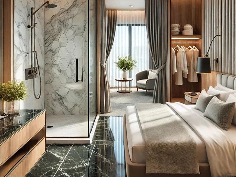 空间布局的精妙,是功能与美学平衡的关键。在 800 平米的尺度下,金牛区优秀的酒店设计总能实现功能分区的清晰化:睡眠区以柔软的床品与柔和的灯光,营造出助眠的氛围;休闲区的单人沙发与边几,成为阅读、小憩的私密角落;卫浴区的玻璃隔断既保证了干湿分离,又通过通透感拓展了视觉边界;开放式衣帽间则兼顾了收纳功能与空间的轻盈感。同时,公共区域如大堂、餐厅与客房区的动线设计流畅自然,既保证了住客的私密性,又提升了整体空间的利用率。这种布局不仅让动线流畅,更让每一处空间都有其专属的情绪价值 —— 无论是商务人士的高效办公,还是度假旅客的慵懒休憩,都能在空间中找到适配的场景。