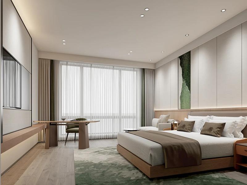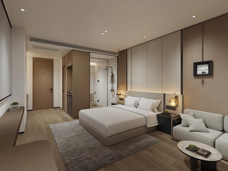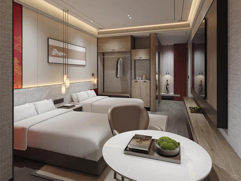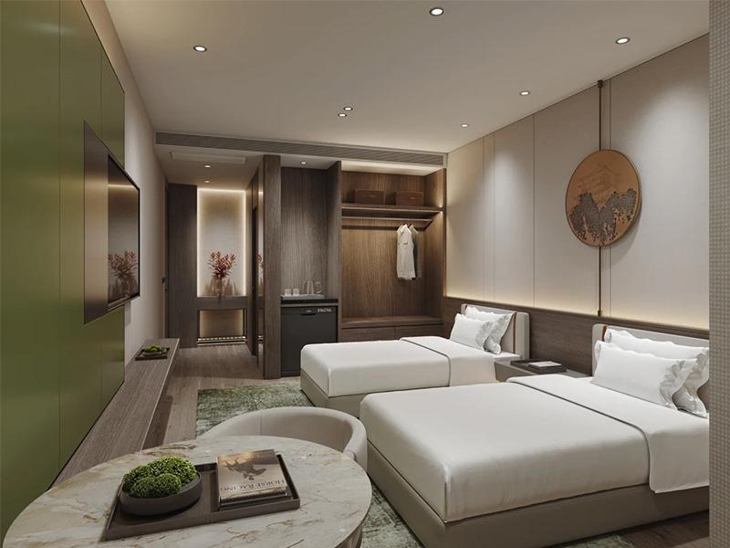 800㎡的空间被巧妙划分为客房区、公区及配套服务区,每一处设计都围绕 “人” 的体验展开。客房采用双床与大床的灵活布局,双床房以深棕木饰面为基底,搭配奶咖色软包与复古绿点缀,开放式衣帽区通透实用,既满足商务差旅的收纳需求,又避免了空间的压抑感;大床房则以浅木色地板呼应川西民居的质朴肌理,莫兰迪色调墙面弱化了视觉冲击,床头金色艺术壁灯与线性灯带交织出轻奢氛围,让住客在忙碌之余获得沉浸式放松。卫浴区采用干湿分离设计,悬浮式洗手台与黑框防雾镜彰显品质,智能温控系统则注入了现代科技的便捷。公区以轻社交为理念,浅灰色大理石吧台与原木长桌形成材质碰撞,局部绿植与艺术装置点缀其间,既适合商务洽谈,也能成为旅途中的休憩角落。设计团队从蜀地文化中汲取灵感,将东方美学以当代语言重新诠释。朱红与深绿的撞色运用,既呼应了成都的自然色彩,又沉淀出东方侘寂的沉静感;粗陶摆件、素麻床品与金属线条的搭配,让传统元素不再厚重,反而成为空间的点睛之笔。无主灯设计成为空间的灵魂,嵌入式筒灯与线性灯带通过光影变化,弱化了建筑的冰冷感,增添了家的温度。墙面装饰画提取龙泉山的自然肌理,将山水意境浓缩于方寸之间,让每一间客房都成为小型艺术空间,实现了一步一景,一境一味的美学追求。在满足商业运营的前提下,设计团队对细节的把控近乎严苛。800㎡的空间利用率被最大化,每一处动线都经过反复优化,确保住客从入住到休憩的流畅体验;环保材料的选用与智能节能系统的植入,既降低了运营成本,也践行了可持续发展的理念。