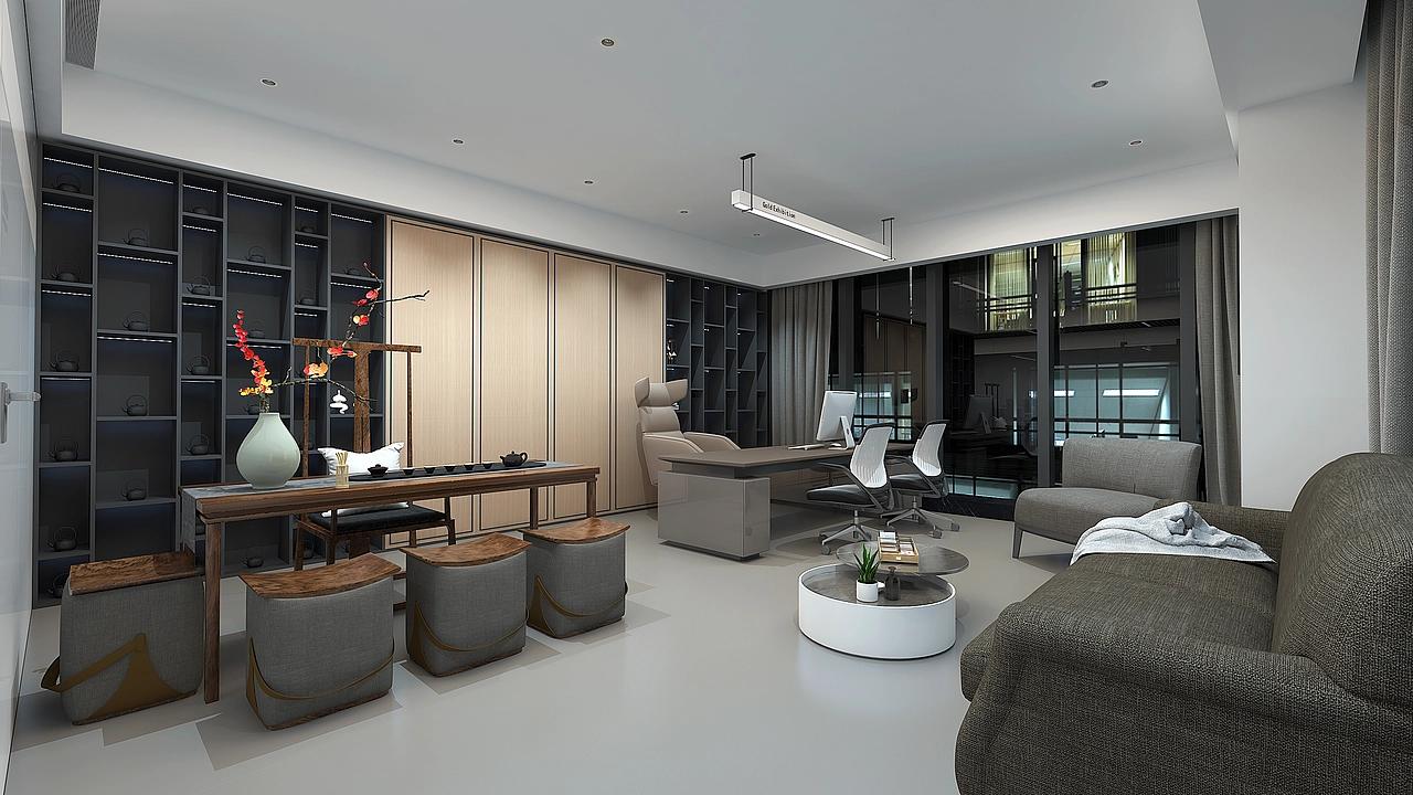 功能区设计精准贴合新媒体业务需求:开放办公区采用模块化工位,搭配简约网布办公椅,兼顾久坐舒适与高效办公;全玻璃围合的会议室配备长桌与专业显示设备,既保障会议私密性,又能通过通透感激发创意碰撞;独立办公室则融入中式茶桌与休闲沙发,在商务氛围中增添雅致接待功能,方便团队洽谈与灵感沉淀。