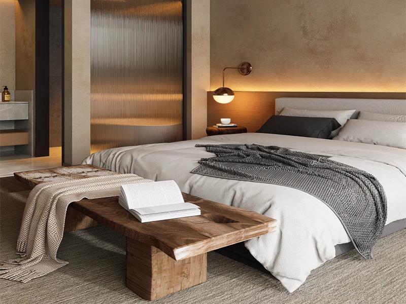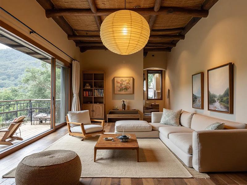 侘寂风的核心,是对自然本真的致敬。在这套民宿设计中,我们摒弃了繁复的装饰,以原木、微水泥、亚麻织物为主要材质,让空间自带温暖粗粝的质感。从入口到客房,每一处墙面都保留着艺术涂料的斑驳肌理,仿佛是时光在建筑上留下的印记;木质天花结构复刻了川西老房的梁架形态,既呼应了地域文化,又让层高更具层次,阳光透过天窗洒下时,木纹理会在光影中流动成温柔的诗行。