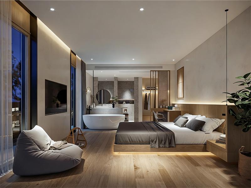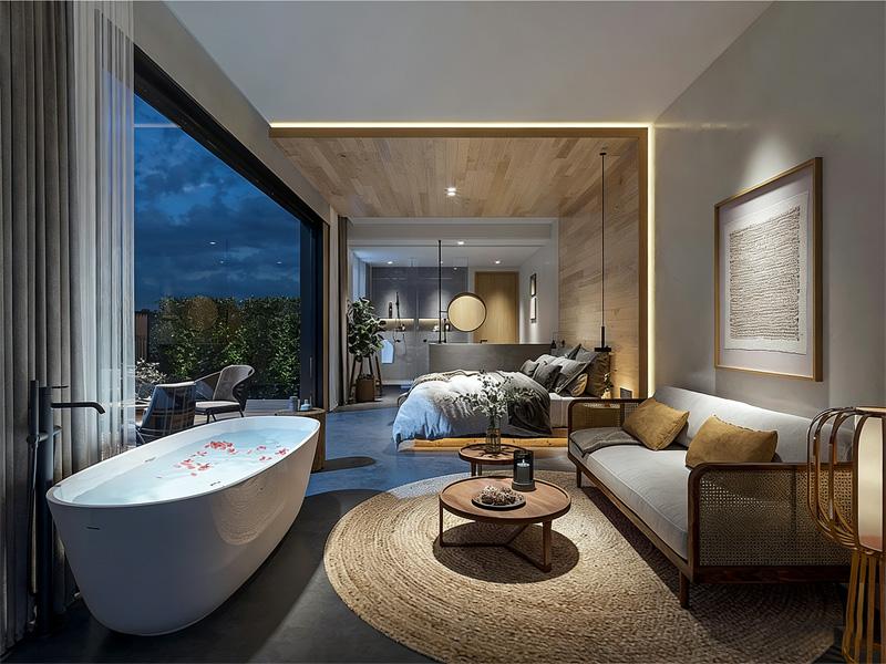 我们偏爱用最本真的材质讲故事 —— 温润的原木、沉静的微水泥、轻盈的藤编,在光影里碰撞出治愈的肌理。客房里打破传统边界,浴缸与卧区无界相连,大面落地窗把天光、绿意甚至星空都请进室内;悬浮床搭配暖光线性灯,既让空间显得开阔通透,又裹着一层慵懒的包裹感,完美诠释了成都民宿酒店设计“让功能藏于美学,让居住回归松弛” 的内核。