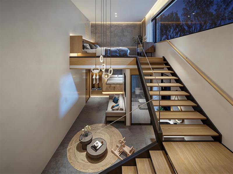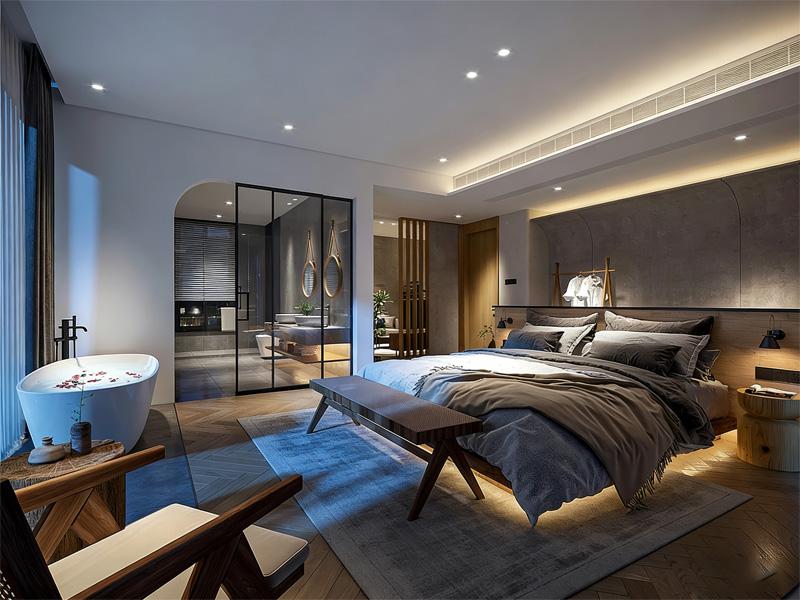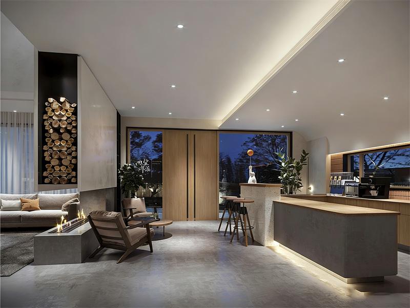 公区则是另一种生活场景的延伸:壁炉跳动的暖光、木质吧台的烟火气、落地窗框住的夜色,让社交与独处都自在从容;LOFT 户型的分层巧思,在有限面积里实现动静分区,上下通透的结构让自然光线肆意穿梭,这正是成都民宿酒店装修公司对空间可能性的探索 —— 让每一处角落都能安放情绪,每一次转身都能遇见惊喜。