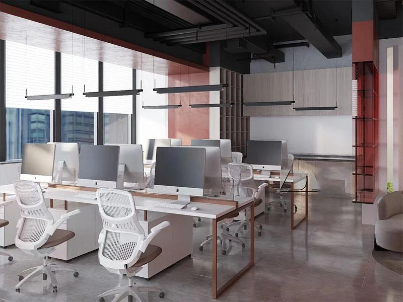 本案以现代简约风格为基底,融入工业风的硬朗肌理与自然材质的温润质感,构建出 “开放通透、动静相宜” 的空间格局。空间布局遵循 “高效协作 + 私密专注” 的核心逻辑,开放办公区摒弃传统封闭隔断,采用模块化工位与低饱和度色彩搭配,规整的工位排列有序,搭配人体工学椅与简约办公设备,既保障团队沟通的流畅性,又通过合理的间距设计保障员工专注度;核心区域的全景落地窗最大化引入自然采光,将城市天际线纳入室内视野,让光影成为空间的 “软装饰”,大幅提升空间的通透感与开阔度。