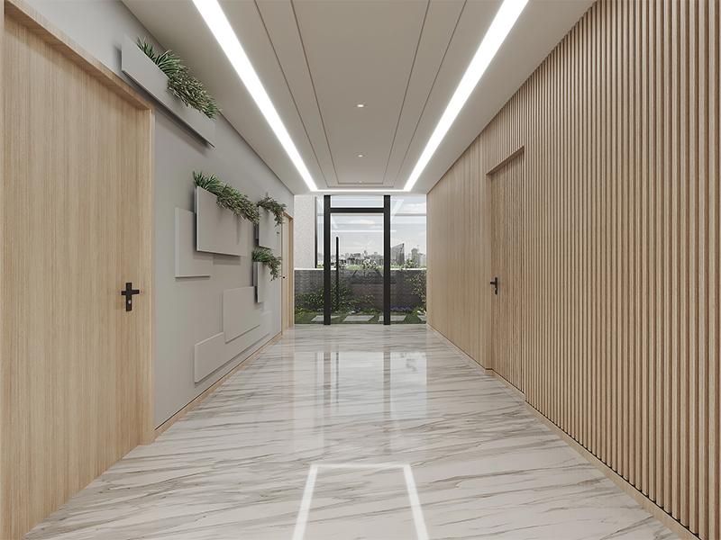 公共走廊作为空间动线核心,采用浅木色格栅门搭配墙面绿植装饰,辅以线性灯带与大理石地面,线条简洁利落,层次丰富立体。设计中巧妙引入窗外自然景观,打破封闭空间的压抑感,既优化了视觉体验,又能让员工在通行途中舒缓身心,同时规整的动线设计,也适配医药企业人员流动、文件转运的高效需求,兼顾美观与实用性。