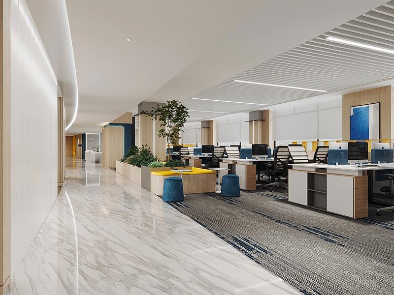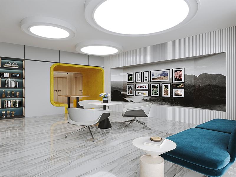 整体空间色调以木色、浅灰与白色为主基调,搭配蓝、黄等亮色做细节点缀,既契合医药行业干净整洁的视觉需求,又摒弃传统办公空间的沉闷刻板,营造出通透、舒适且富有活力的办公氛围。材质选用上优先考量环保性、耐用性与易清洁性,贴合医药行业对空间洁净度、安全性的严苛要求,同时通过自然材质的融入,弱化商务空间的冰冷感,实现理性与温情的平衡。