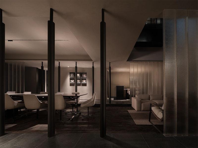 空间以深灰、炭黑与暖米为基底,大面积运用哑光石材、做旧金属与清透玻璃,在低调中传递出高级质感。黑色圆柱与裸露的混凝土梁架起空间骨架,既保留了建筑本身的力量感,又通过垂直线条划分出功能区域,让开放办公区、会议区与休闲区既相互连通又彼此独立。半透的金属网帘与磨砂玻璃作为软隔断,在保证采光通透的同时,巧妙化解了空间的空旷感,为私密交流预留了可能性。