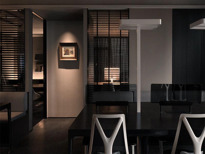 照明设计是本案的点睛之笔。摒弃了刺眼的主灯,转而采用嵌入式筒灯、线性灯带与落地灯的组合,通过局部打光勾勒墙面挂画、照亮桌面与通道,让光线在不同材质表面形成明暗对比,既满足了办公功能需求,又营造出静谧深邃的氛围。傍晚时分,暖光从灯带中漫溢而出,与窗外的城市灯火交相辉映,让办公空间褪去白日的理性,多了几分温柔的烟火气。