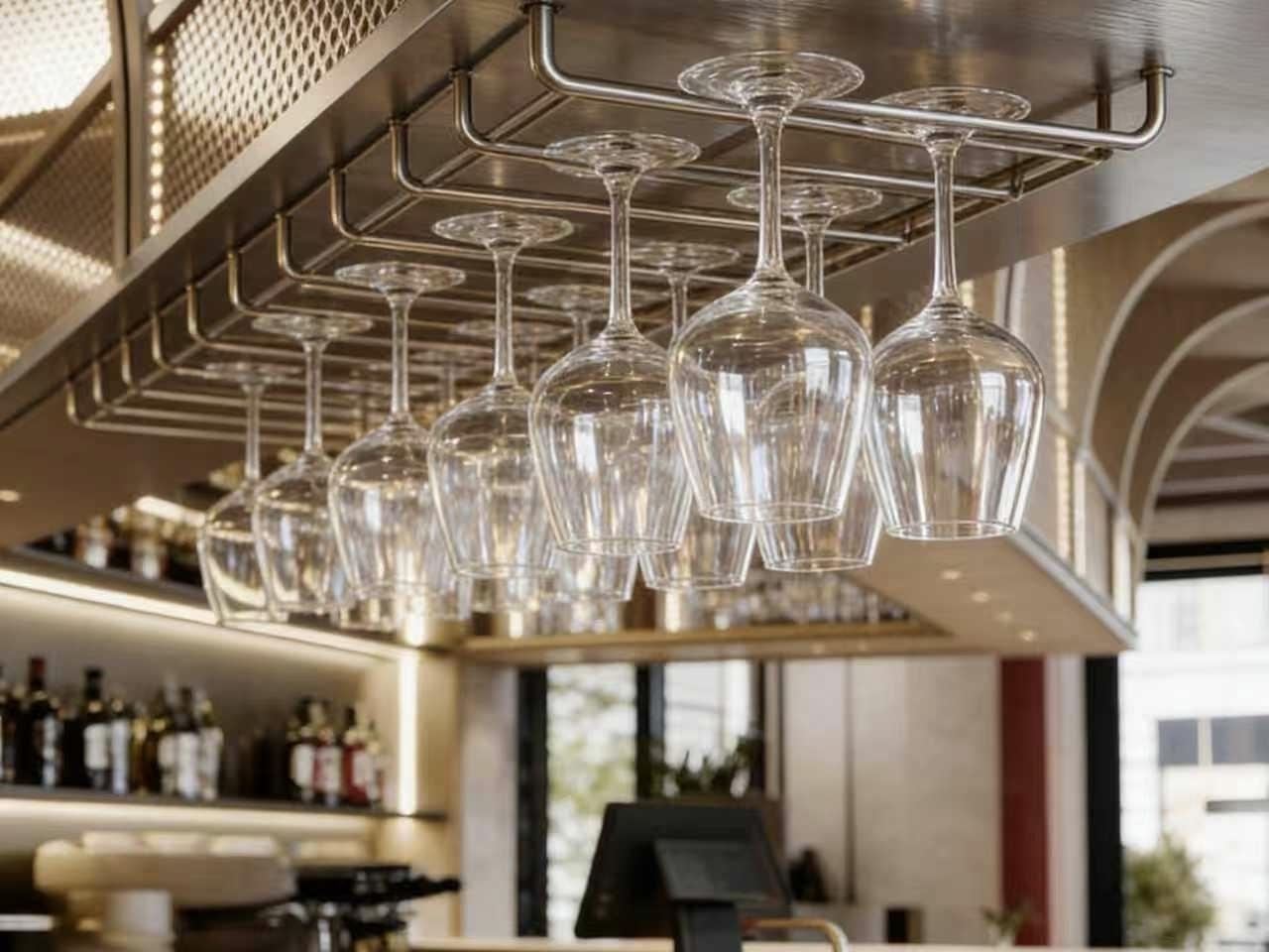 空间叙事:木与光的温柔对话,整体空间以温润木色为基底,搭配大理石地面的自然纹理,构建出沉稳而富有层次的基调。天花设计:弧形木构吊顶如波浪般延伸,既柔化了空间线条,又通过结构分割引导动线,让自然光与人工照明形成温柔互动。材质碰撞:金属冲孔板与木质元素的组合,在保留温暖感的同时,注入了现代工业的精致细节,让空间更具呼吸感。色彩点睛:局部红色地砖与暖灰布艺沙发形成视觉对比,既划分了功能区域,又为空间注入活力与温度。功能布局:高效与舒适的平衡,我们在设计中充分考虑了餐饮运营的实际需求,实现了美观与实用的完美统一:吧台区域:开放式吧台作为空间核心,酒架与杯架的模块化设计既便于取放,又成为展示亮点;高脚椅与弧形吧台的搭配,兼顾了社交互动与操作便捷性。卡座区:弧形半围合卡座提供了私密感与安全感,底部暗藏的氛围灯条在夜间营造出柔和光晕,让用餐体验更具仪式感。散座区:灵活的方桌与单人椅组合,可满足不同人数的用餐需求,同时保证了空间通透感与通行效率。