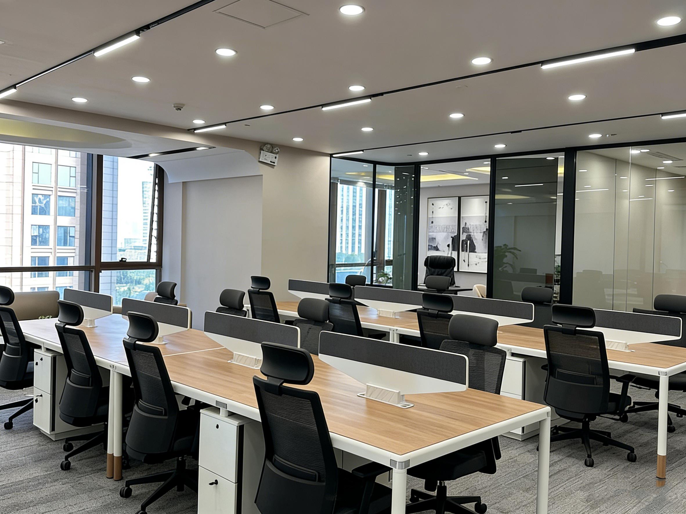 项目整体采用开放式办公区 + 独立经理室 + 多功能会议室的模块化布局,既满足团队日常协作的开放性需求,又保障高管办公与商务洽谈的私密性。开放办公区以浅木色办公桌搭配黑白灰经典色调,通透玻璃隔断最大化引入自然采光,让空间显得开阔明亮;线性灯与筒灯的组合照明,既保证了办公区域的充足照度,又通过光影层次提升空间精致感。
