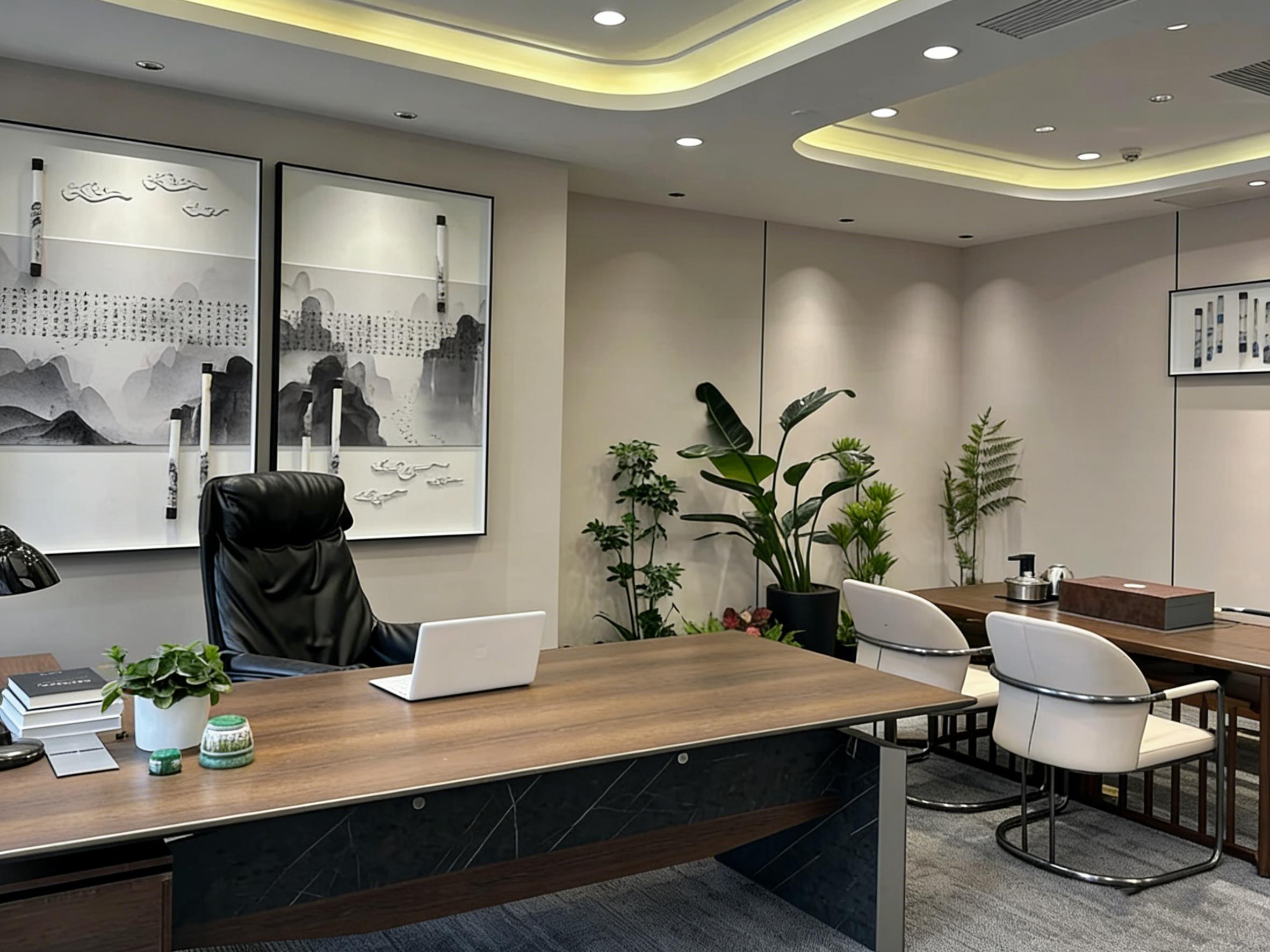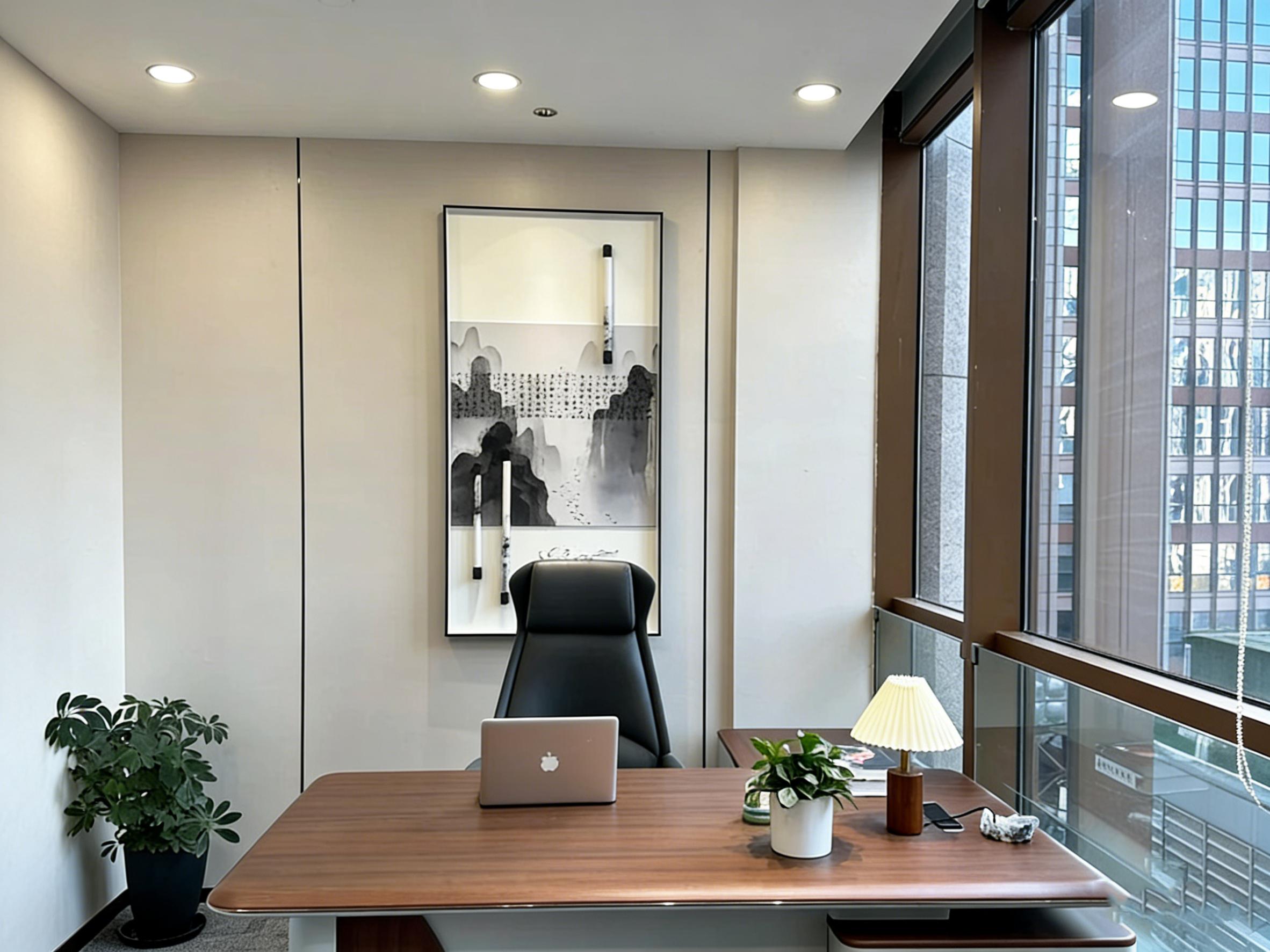 独立经理室则延续了整体简约风格,同时融入中式山水挂画与绿植点缀,在硬朗的城市景观窗外,营造出沉稳雅致的商务氛围。木质办公桌与皮质座椅的搭配,兼顾了舒适感与品质感,既符合高管办公的功能需求,又彰显企业稳重专业的品牌形象。