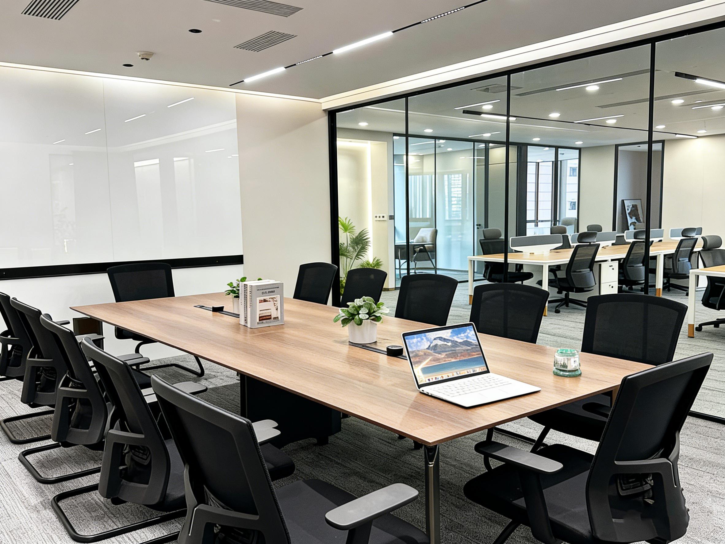 多功能会议室作为空间核心功能区,采用全玻璃隔断设计,既保证了空间的通透感,又能灵活满足会议、培训、洽谈等多元场景需求。长条形会议桌与人体工学椅的配置,让每一位参与者都能获得舒适的体验,而墙面留白与绿植点缀,则为严肃的商务场景注入了自然活力。