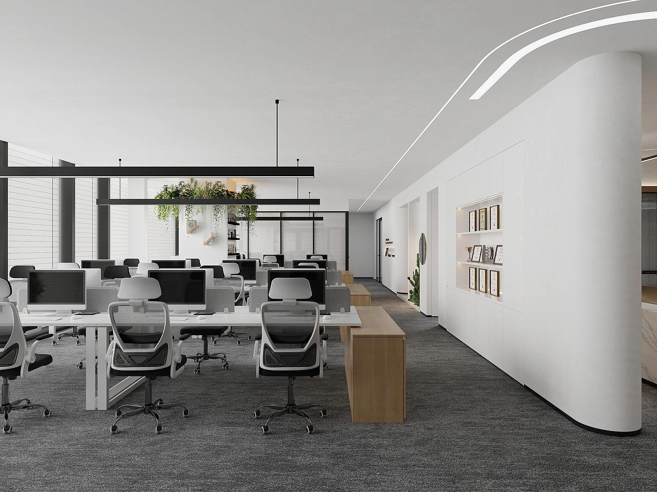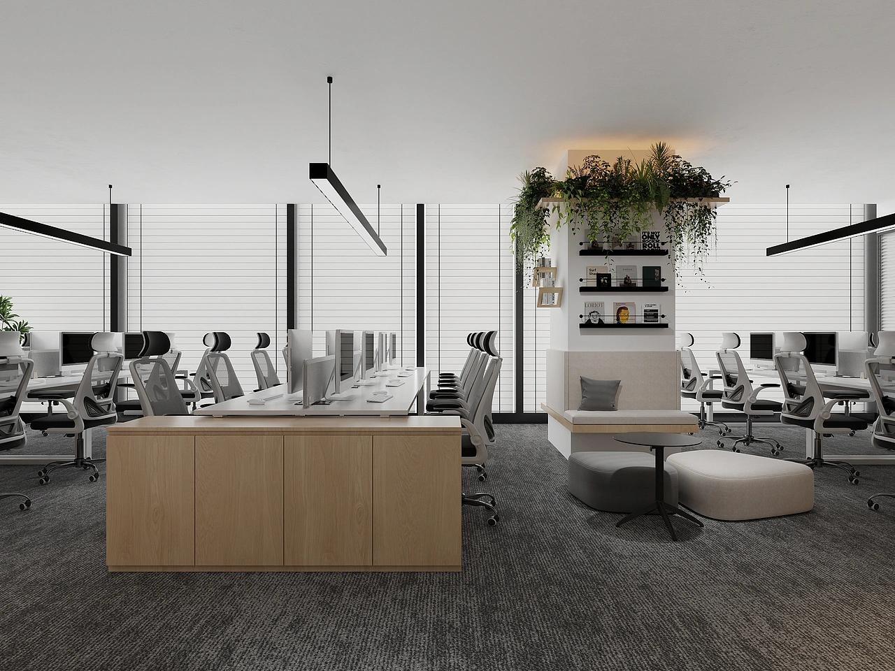 整体空间以白、木色、灰为主色调,三大色系相互交融,既依托白色与灰色塑造出金融空间应有的干净通透、理性专业的氛围,又借助浅木色的温润质感中和冷硬感,赋予空间温暖柔和的气息,打破传统金融办公空间的沉闷刻板。开放办公区作为核心功能区,布局规整有序,贴合1500平大空间的尺度规划,选用浅木色办公家具搭配灰白人体工学椅,兼顾美观与久坐舒适度;线性吊灯搭配百叶窗设计,让自然光与人工照明完美融合,光线柔和均匀铺满整个区域,搭配零星点缀的绿植,既能缓解员工长时间办公的视觉疲劳,又能为理性的办公空间注入自然生机,提升整体办公幸福感。