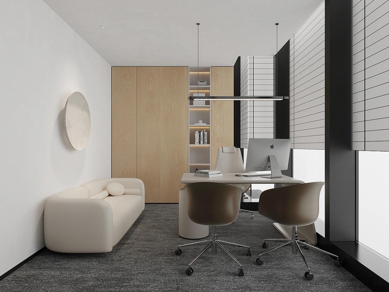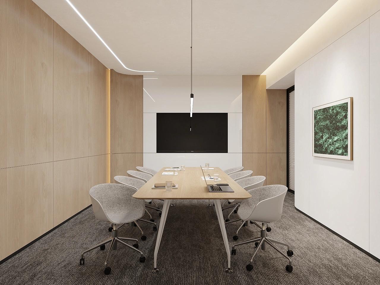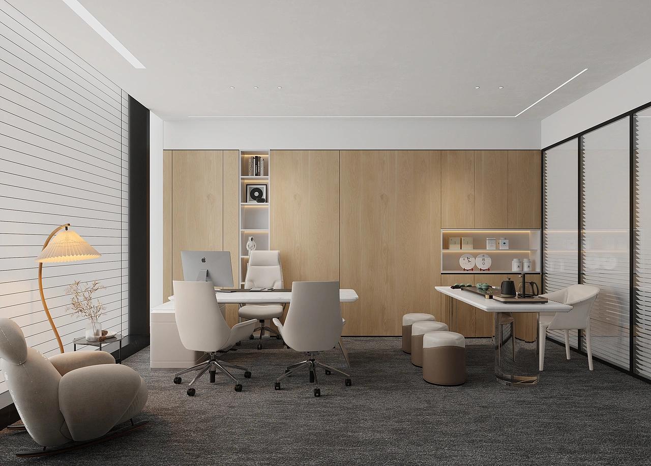 会议室作为商务决策、客户洽谈的核心场景,以木饰面装饰搭配线性灯光,营造出沉稳大气、专业严谨的氛围,搭配简约利落的会议桌椅,摒弃多余装饰,聚焦高效沟通核心,完美适配金融行业高频次、高规格的洽谈与会务需求。独立办公室则兼顾办公与休闲双重属性,一侧规划专属茶区,搭配软质休闲椅与一体化木色柜体,既满足高管日常办公、私密洽谈的需求,又能打造放松休憩的小天地,让空间更具温度与实用性,兼顾工作效率与人文关怀。
