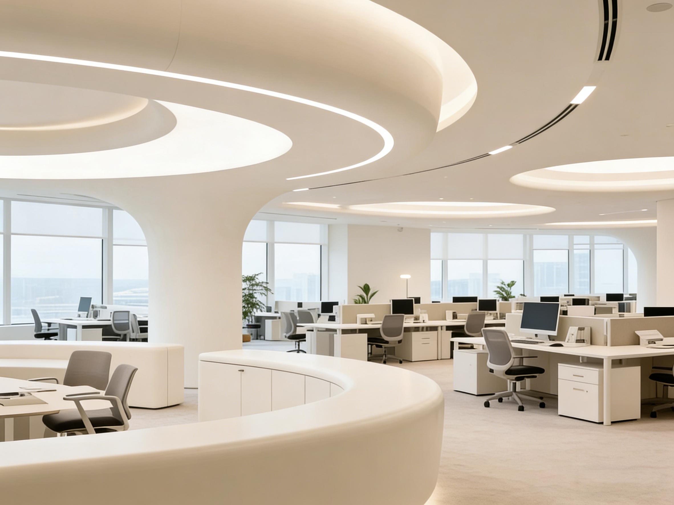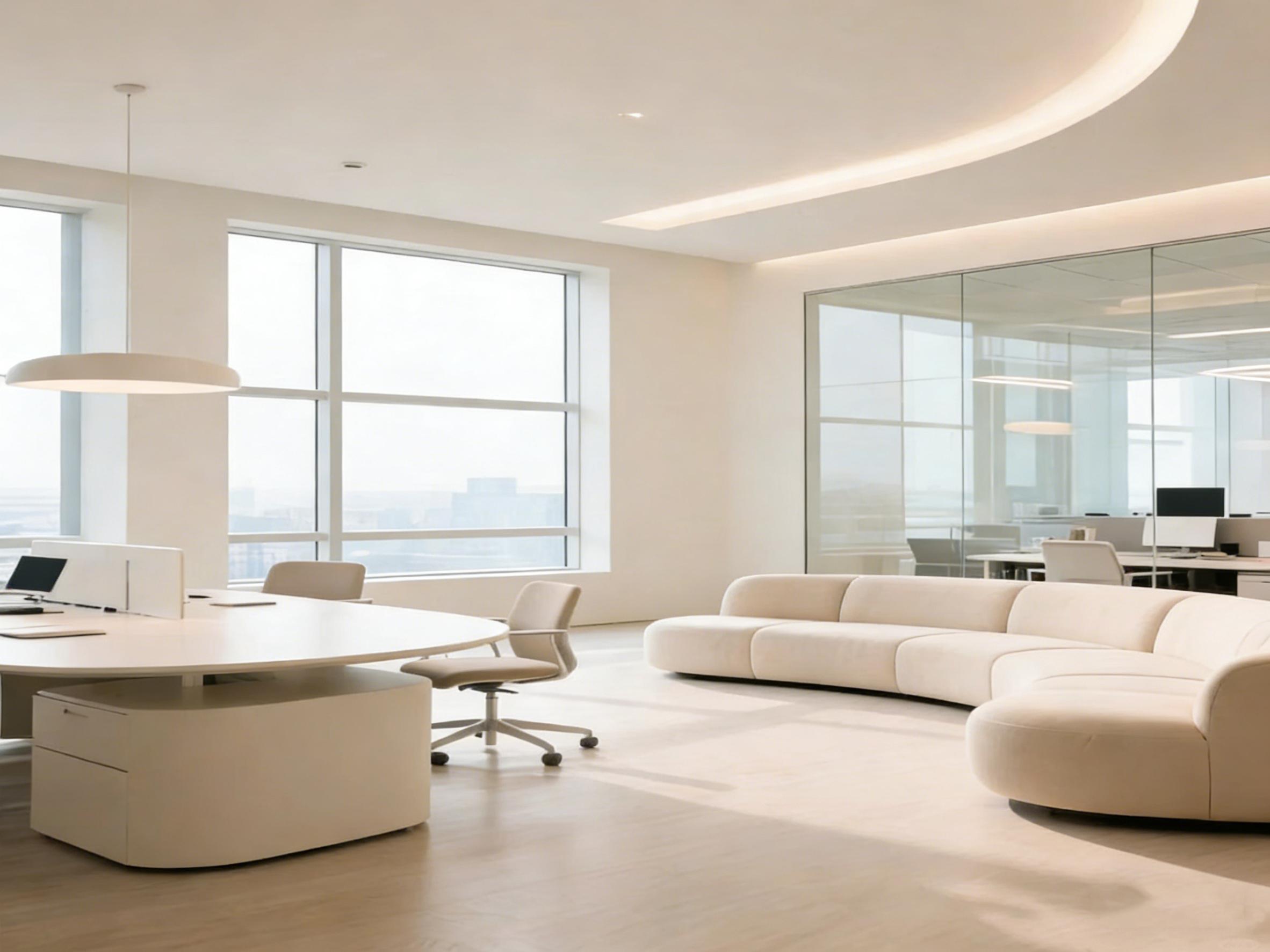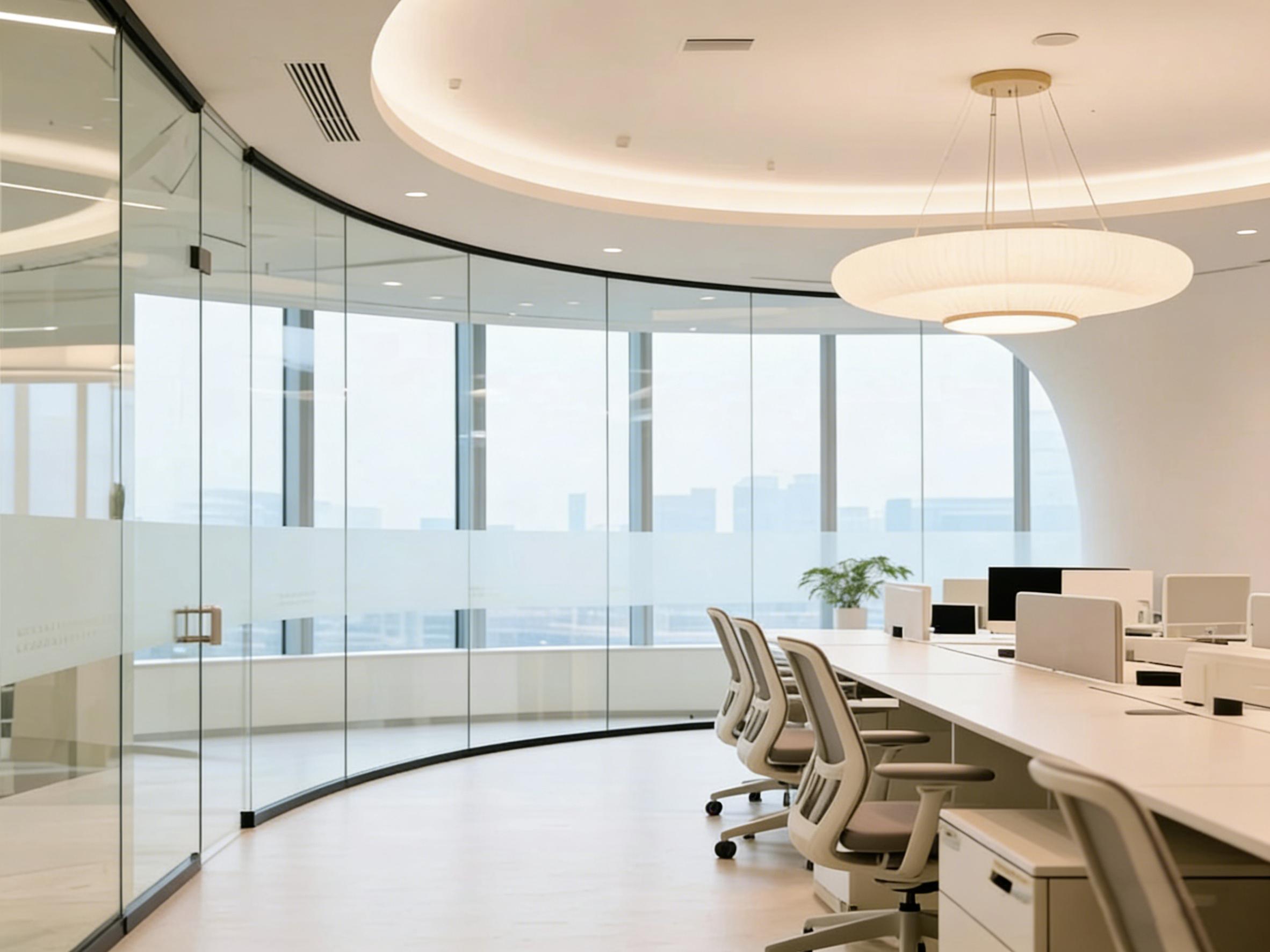 设计上,弧形玻璃隔断与曲线吊顶形成巧妙呼应,打破了传统办公空间的生硬边界,既保证了各功能区域的通透质感,又实现了开放与私密的合理划分。开放式办公区采用灵活的模块化桌椅组合,可根据团队规模与协作需求灵活调整,适配多元办公场景;大面积落地窗将青羊区的城市风光引入室内,搭配柔和的线性灯带与简约艺术吊灯,构建出明亮柔和、不刺眼的舒适光环境,有效缓解办公疲劳。
