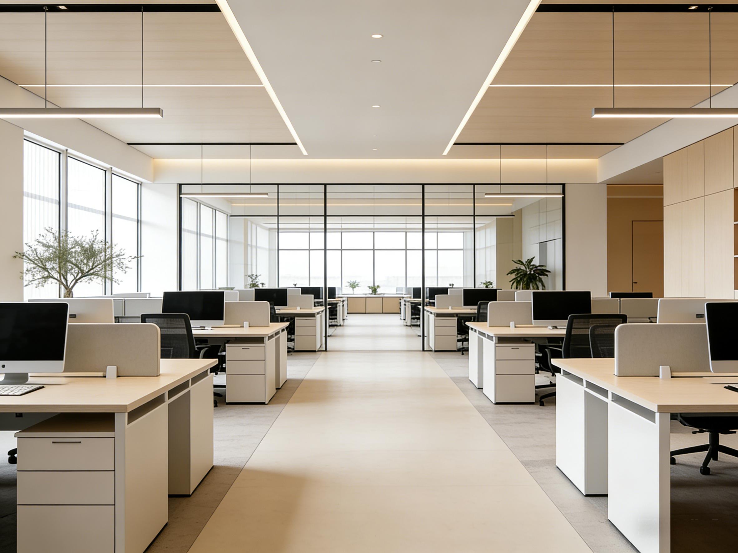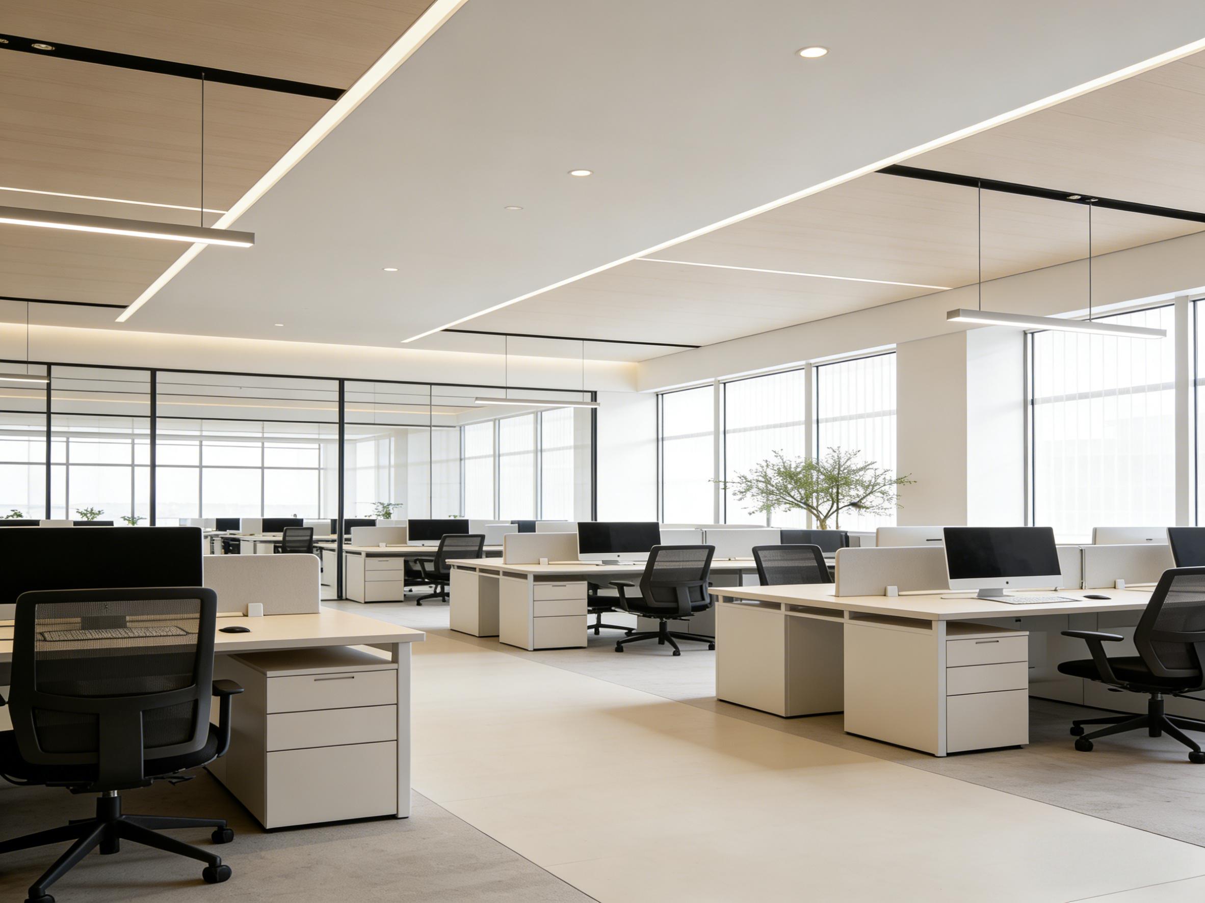 对于科技型企业与创新团队,壹西格玛打造 “科技感 + 开放协作” 现代风格,通过裸露管线设计、智能控制系统与模块化工位布局,激发空间活力。丰德成达中心办公室项目以通透玻璃幕墙引入自然光线,搭配智能设备与灵活布局,完美适配科技企业高效协作与创新需求。