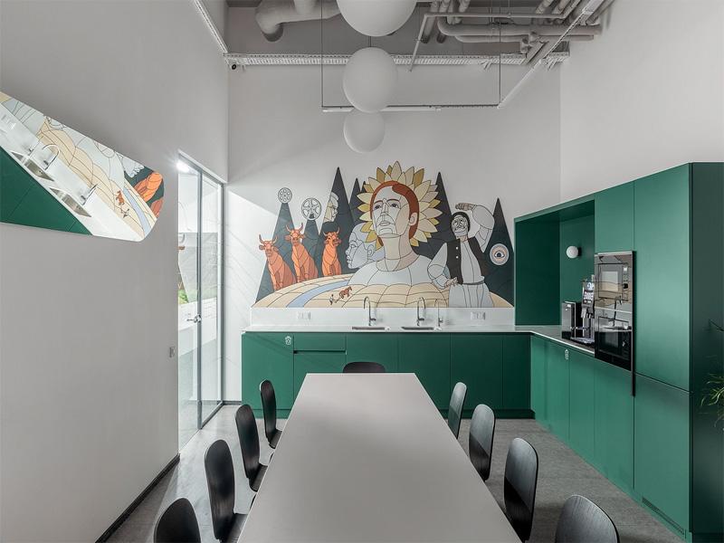茶水间与会议室的设计则进一步强化了人文关怀:艺术感壁画为日常场景注入艺术氛围,简约长桌与舒适座椅构建了平等交流的场域,让创意碰撞在轻松氛围中自然发生。从公共休闲到私密办公,从工业质感至自然温润,每一处细节都在诉说着我们对办公空间的理解:好的设计,是让功能与美感共生,让效率与温度并存。