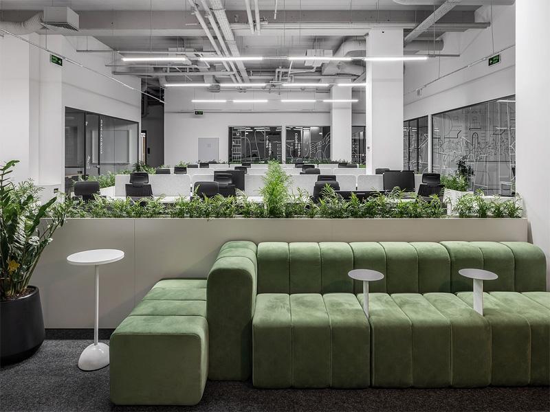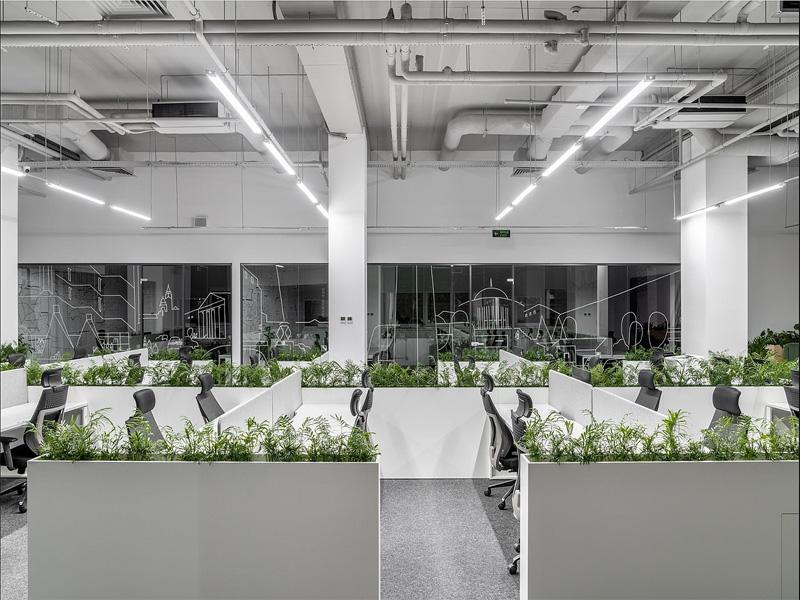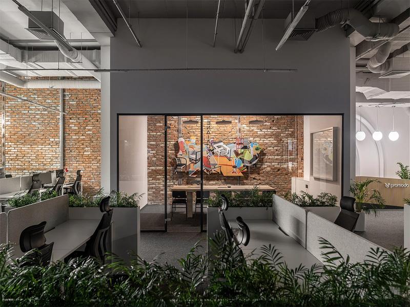 步入空间,裸露的管道与红砖墙勾勒出硬朗的工业基底,而大量绿植的植入则柔化了冰冷的线条 —— 从墙面悬挂的盆栽到工位隔断的绿意屏障,再到休闲区的茂密植株,自然元素贯穿始终,既净化了空气,也为职场人营造了舒缓的视觉体验。这种「刚柔并济」的设计手法,正是成都办公室装修中备受青睐的平衡之道,让高效办公与身心疗愈得以共存。