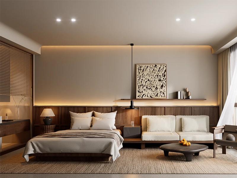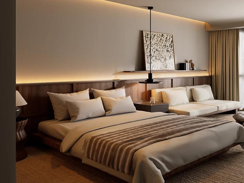 无主灯设计是空间的点睛之笔。天花板嵌入式筒灯提供基础照明,床头暗藏的暖黄灯带勾勒出木质背景的轮廓,单头吊灯则为休闲区注入艺术感。当夜幕降临,灯光与木质肌理相互交融,消解了旅途的疲惫;而白天,自然光透过百叶窗洒入,在地面投下斑驳光影,让空间随时间流转出不同的情绪。