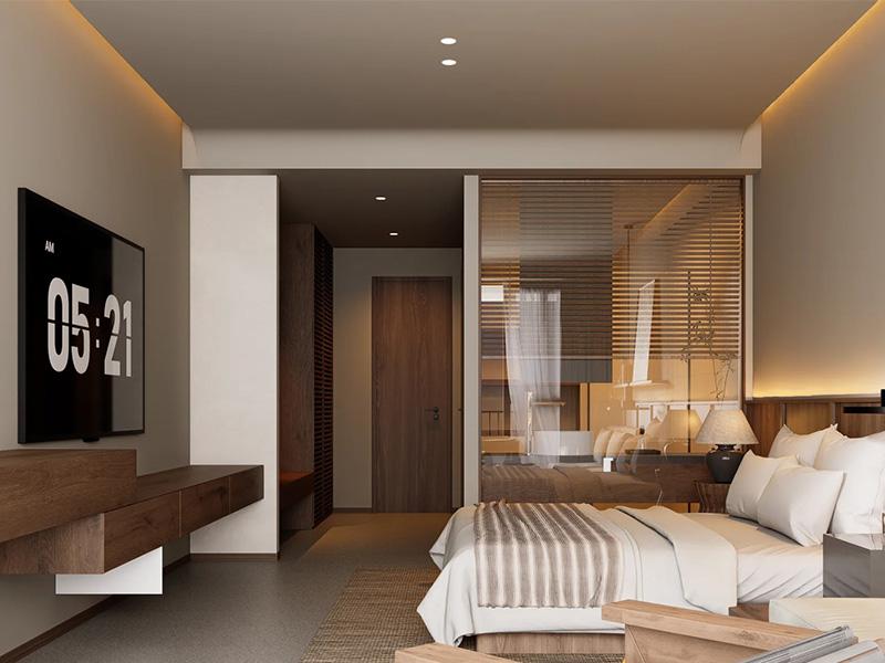 设计师采用一体化开放式布局,将睡眠区与休闲区自然衔接。悬浮式床架搭配一体化床头背景,既弱化了家具的厚重感,又通过暗藏灯带营造出柔和的夜间氛围;双人沙发与异形茶几组成的休闲角,成为住客小坐、交谈的理想场所。半透木百叶与长虹玻璃作为隔断,既保证了卫浴区的隐私,又让光线与视线得以流动,让 700㎡的空间显得通透而不压抑。