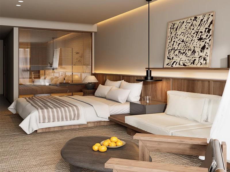 在成都温江区这片兼具自然肌理与都市烟火的土地上,一间 700㎡的酒店正以侘寂风设计,重新定义旅居的松弛感。摒弃传统酒店的繁复装饰,设计师以 “少即是多” 的美学逻辑,将原木、亚麻与光影编织成一处治愈空间,让每一位住客都能在喧嚣中找到归心之所。