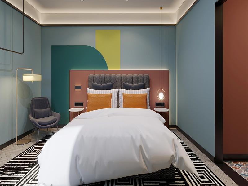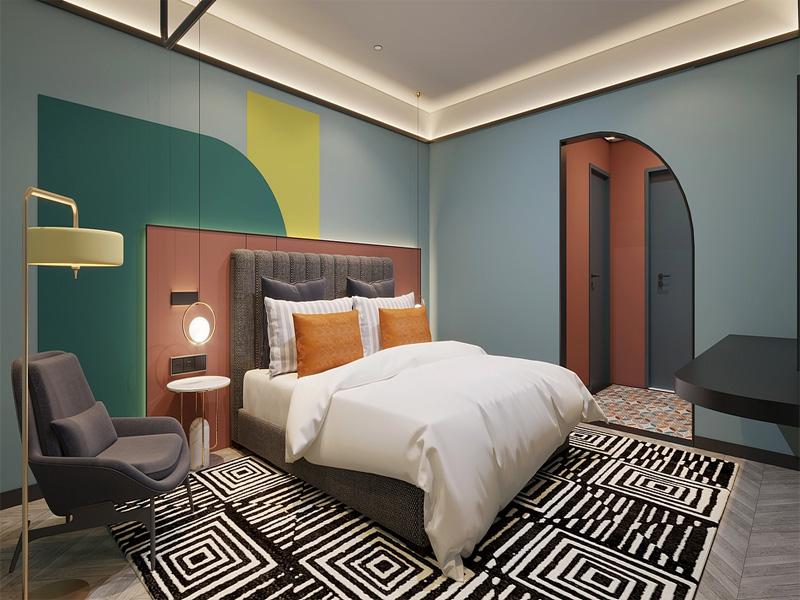 在色彩碰撞的客房案例中,我们以低饱和蓝为基底,搭配复古绿与暖橙色块,打破传统酒店的单调感。豆沙色软包床头与几何纹样地毯相互呼应,金属线条灯具与弧形门洞细节,让空间在活泼中不失精致。这样的设计既满足了成都精品酒店装修对视觉记忆点的需求,又通过柔和材质与灯光,保障了住客的睡眠体验,让每一位旅人在色彩律动中卸下疲惫。