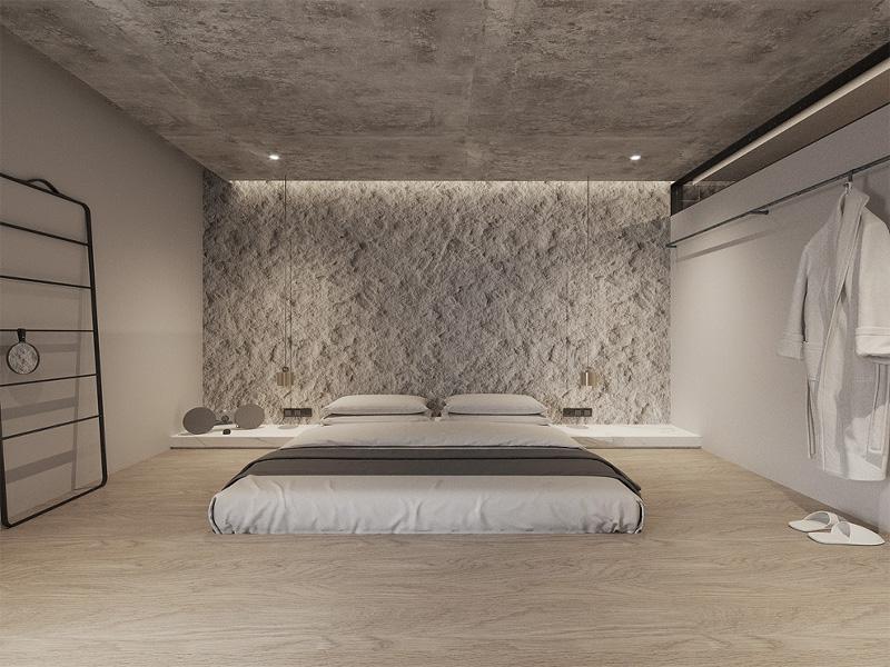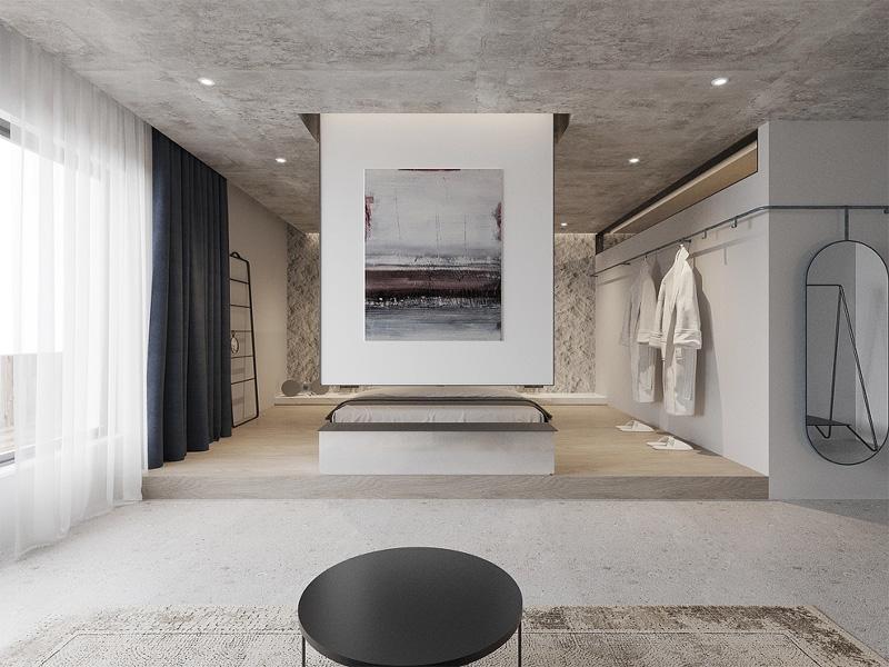 而在侘寂风客房的呈现里,我们回归材质本真。裸露的水泥顶面与自然肌理石质背景墙,搭配原木地板与极简悬浮床架,褪去冗余装饰,凸显空间的静谧与力量。开放式挂衣区与线性灯光的运用,在成都精品酒店设计中实现了功能与美学的平衡,让住客在质朴氛围中感受慢生活的温度,契合当代人对松弛感旅居的追求。