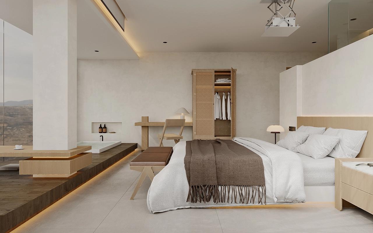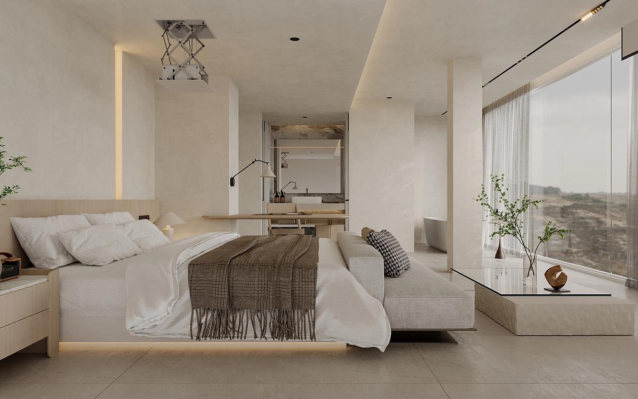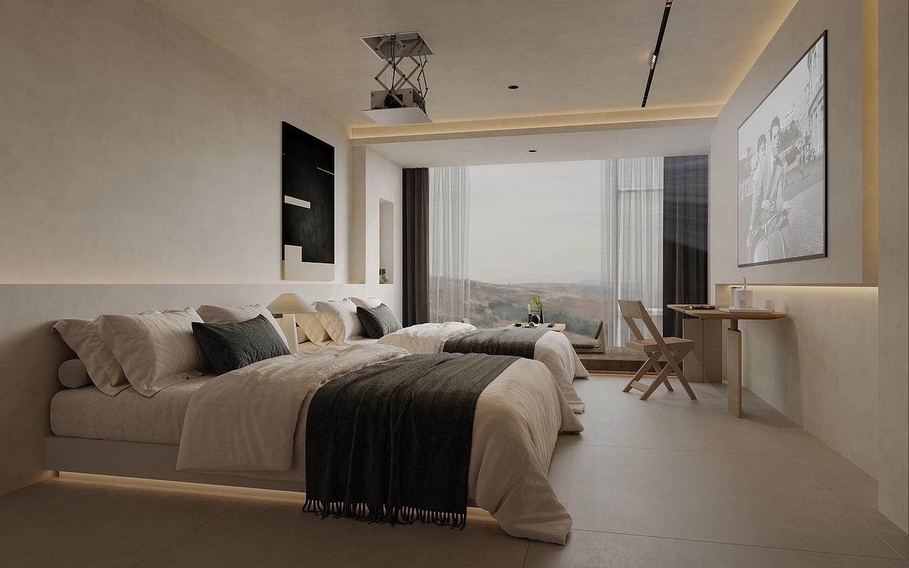 功能区规划上,结合民宿运营需求与度假人群的核心诉求,进行科学合理的分区设计,彰显公装设计的专业性。整体布局通透开放,客房、公区、休闲区有序衔接,互不干扰又相互呼应。卫浴与睡眠区采用半隔断设计,既保证了住客的隐私需求,又延伸了视觉空间,让小空间也能拥有开阔感;部分房型精心设置悬浮床、观景浴缸与休闲茶座,悬浮床简约轻盈,减少空间压迫感,观景浴缸紧邻落地窗,让住客在沐浴时也能欣赏山林美景,休闲茶座则为住客提供了放空发呆、品茗赏景的专属空间,兼顾了居住的舒适性与度假的仪式感。