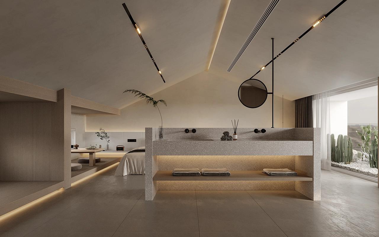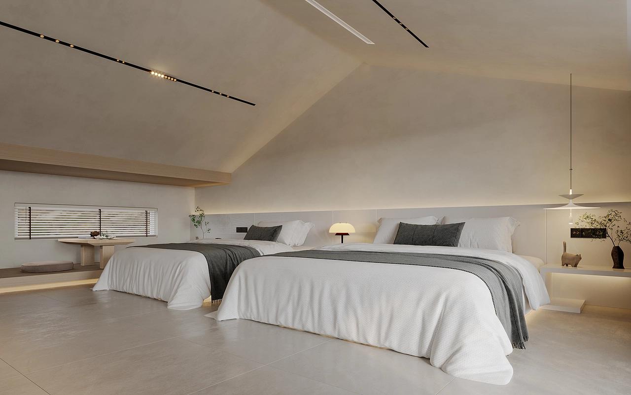 空间布局上,依托1600平的大面积优势,遵循通透开放的原则,兼顾功能性与观赏性,充分体现公装设计的合理性与科学性。整体空间线条干净利落,摒弃繁复装饰,通过斜顶设计拉伸空间层次感,搭配通顶落地窗这一“借景神器”,将户外青城后山的苍翠山林、氤氲云雾毫无保留地引入室内,弱化了室内外的边界,让住客在民宿的每一个角落,都能沉浸式感受山林的静谧与灵动。灯光设计同样贴合侘寂风调性,摒弃厚重的主灯设计,以磁吸轨道灯、线性灯带和局部壁灯为主,光线柔和舒缓,层层递进,既满足了不同区域的照明需求,又营造出柔和静谧的光影层次,让空间更具氛围感与治愈感。