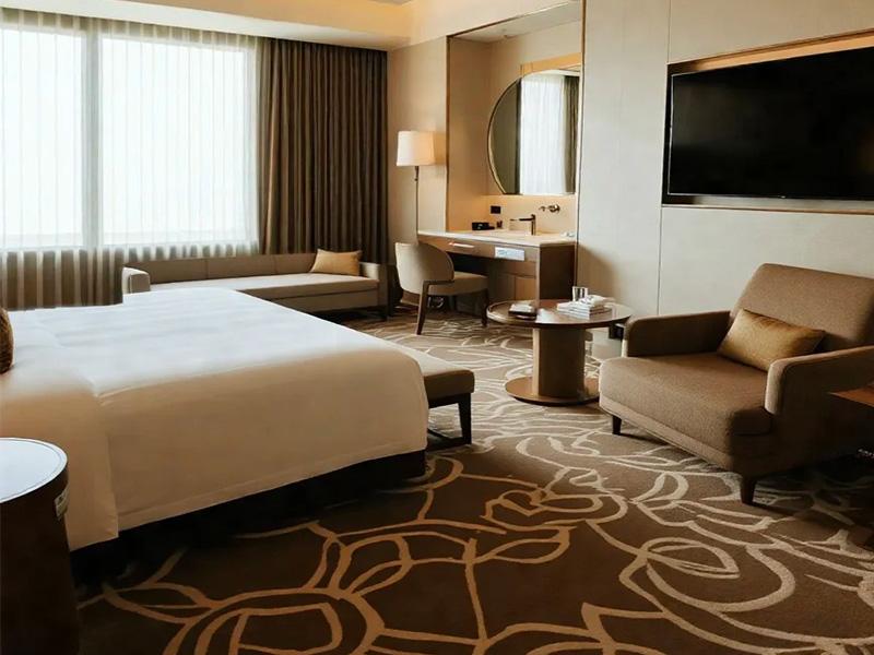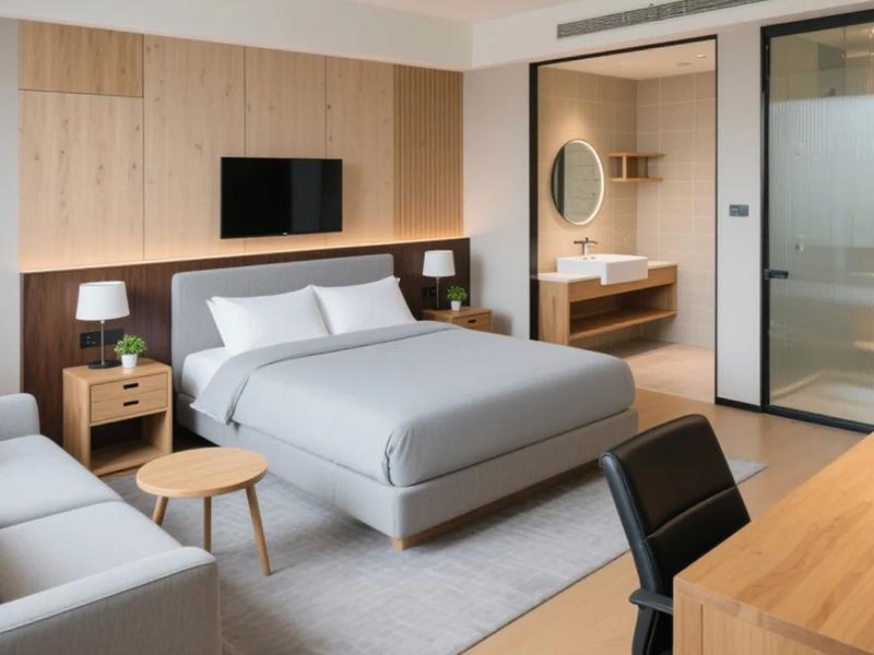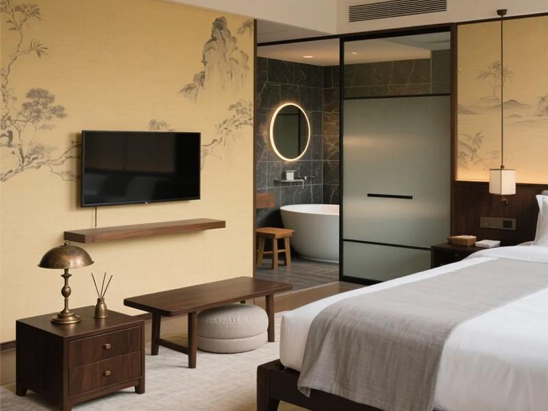 在功能布局上,酒店充分利用 800 平米的空间尺度,实现了动静分区的完美平衡。公共区域以浅棕与米白为主调,通透的落地窗将自然光线引入室内,搭配柔软的布艺沙发与简约茶几,成为住客交流、小憩的理想场所。而私密的客房则通过玻璃隔断与磨砂玻璃门,巧妙划分出睡眠区与卫浴区,既保证了空间的通透感,又守护了住客的隐私。新中式风格的客房更是将东方美学融入细节,山水墨画墙纸与铜制灯具相映成趣,浴缸旁的木质矮凳、床头的素雅挂画,处处透着成都人 “慢生活” 的雅致与从容。