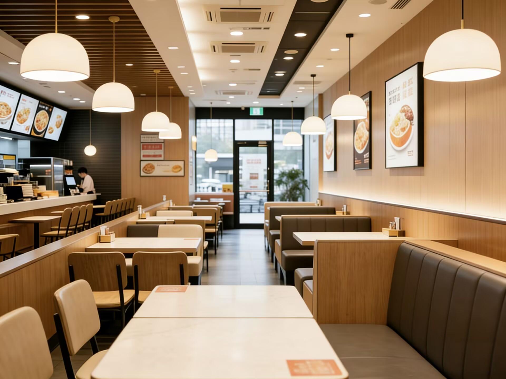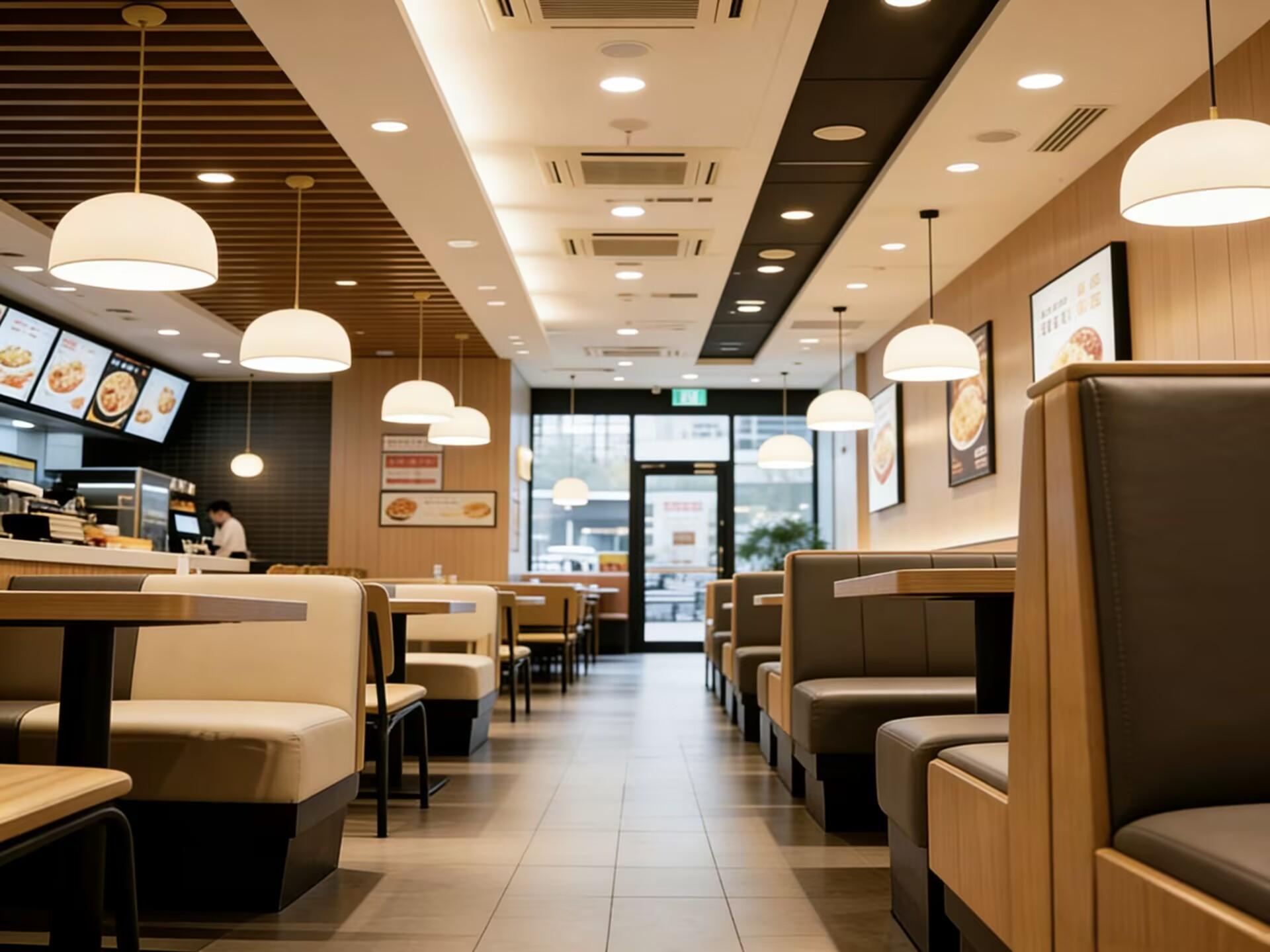 空间整体采用暖木色与暖光为主的设计基调,大面积使用浅木饰面作为墙面主材,搭配深灰色软包卡座与米白色餐椅,形成柔和且有层次的视觉效果。顶面采用木格栅与黑色吊顶结合的造型,既隐藏了空调、管线等设备,又通过纵向线条拉伸了空间高度,让狭长的门店显得开阔通透。嵌入式筒灯与悬挂式半球形吊灯形成双重照明系统,暖白色灯光均匀覆盖用餐区,既保证了用餐的明亮度,又营造出温馨放松的氛围,弱化了快餐空间的冰冷感,提升顾客停留的舒适度。